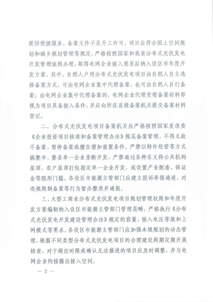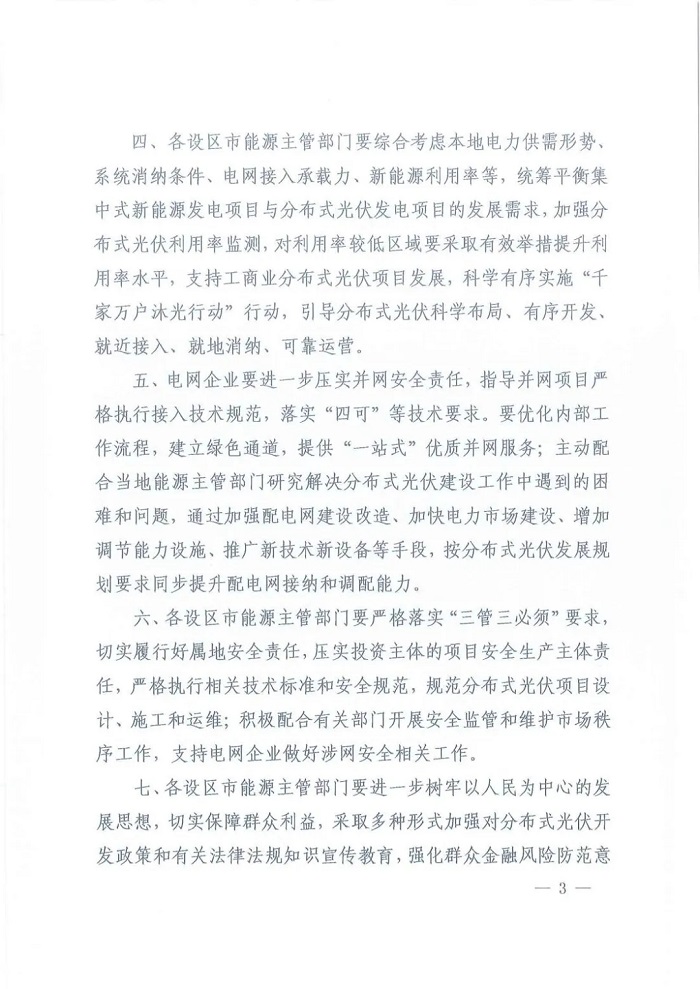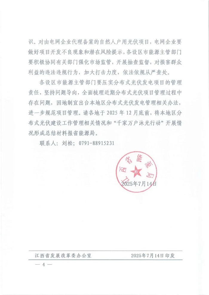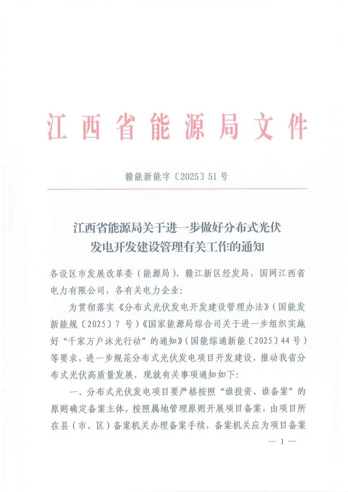 储能中国网获悉,7月14日,江西省能源局下发关于进一步做好分布式光伏发电开发建设管理有关工作的通知。通知指出, 1、大型工商业分布式光伏发电项目规划管理权限和年度开发方案编制纳入设区市能源主管部门管理范畴; 2、电网企业要进一步压实并网安全责任,指导并网项目严格执行接入技术规范,落实“四可”等技术要求。 3、加强分布式光伏利用率监测,对利用率较低区域要采取有效举措提升利用率水平。通过加强配电网建设改造、加快电力市场建设、增加调节能力设施、推广新技术新设备等手段,提升配电网接纳和调配能力。 4、对于超出时限或确认无法推进的项目应及时调整,并与电网企业衔接腾出接入空间。 5、严禁以特许经营等方式搞整市、整县单一企业垄断开发,严禁通过各种名义将公共机构屋顶、农户屋顶打包指定单一企业开发,或设置产业配套、保证金等隐形门槛。 6、科学有序实施“千家万户沐光行动”行动,请各地于2025年12月底前,将本地区“千家万户沐光行动”开展情况形成总结材料报省能源局。 原文如下: