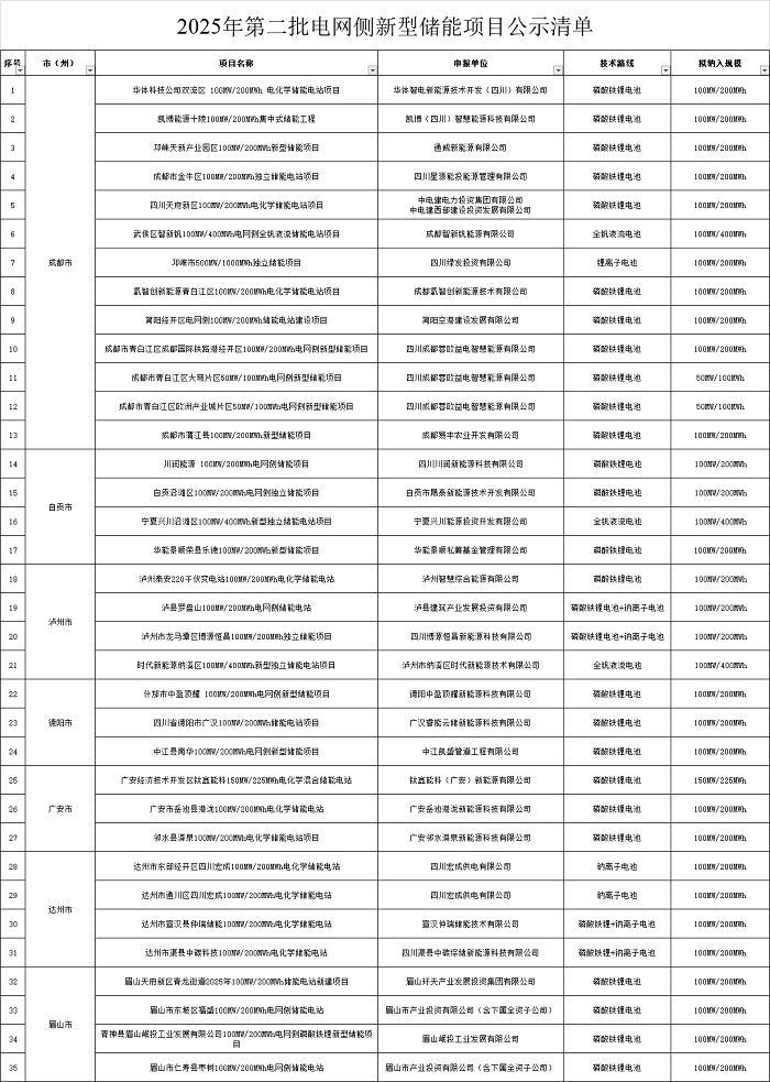 储能中国网获悉,9月11日,四川省发展和改革委员会发布关于拟纳入2025年第二批电网侧新型储能项目清单的公示。本次公示35个项目,规模共3450MW/7425MWh。其中,磷酸铁锂电池约2450MW/4825MWh,钠离子电池约200MW/400MWh,全钒液流电池300MW/1200MWh。 公示文件表示,本次纳入清单项目原则上在成都、自贡、泸州、德阳、内江、宜宾、广安、达州8个迎峰度夏期间有电力缺口或局部供电卡口的区域,因眉山电网直接嵌入成都立体双环网,在该区域建设新型储能项目能够有效支撑成都电网安全稳定运行,故一并纳入。 原文如下: 关于拟纳入2025年第二批电网侧新型储能项目清单的公示 根据《关于开展2025年第二批电网侧新型储能项目申报工作的通知》要求,本次纳入清单项目原则上在成都、自贡、泸州、德阳、内江、宜宾、广安、达州8个迎峰度夏期间有电力缺口或局部供电卡口的区域,因眉山电网直接嵌入成都立体双环网,在该区域建设新型储能项目能够有效支撑成都电网安全稳定运行,故一并纳入。经相关市推荐和专家评估论证,拟将“华体科技公司双流区100MW/200MWh电化学储能电站”等35个项目纳入新型储能项目清单,现予以公示。项目正式纳入清单后,将按照市场化方式推动项目实施,相关市能源行业主管部门和电网企业做好协调保障工作。 公示时间为2025年9月12日至9月19日。公示期间,对公示项目有异议的,请以书面形式提出(单位反映情况请加盖公章,个人反映情况请留真实姓名及联系方式,以便核实查证)。对匿名或无具体事实依据的异议,以及其他不正当要求,不予受理。 通信地址:成都市锦江区滨江东路156号发展大厦省能源局综合处(收) 联系电话:028-86705619 附件:拟纳入2025年第二批电网侧新型储能项目清单 四川省能源局 2025年9月11日