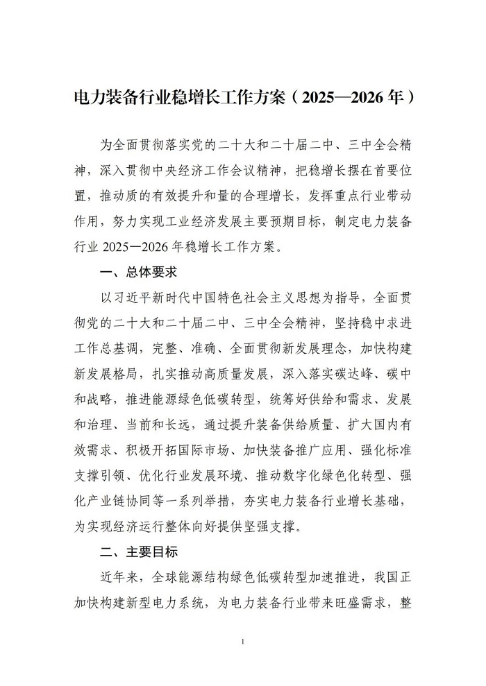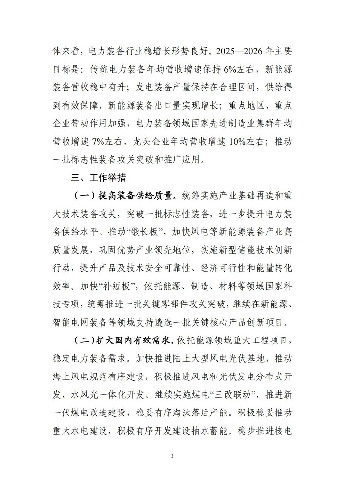 储能中国网获悉,9月12日,工业和信息化部 市场监管总局 国家能源局关于印发《电力装备行业稳增长工作方案(2025-2026年)》的通知。其中,《方案》表示,2025-2026年主要目标是:传统电力装备年均营收增速保持6%左右,新能源装备营收稳中有升;发电装备产量保持在合理区间,供给得到有效保障,新能源装备出口量实现增长;重点地区、重点企业带动作用加强,电力装备领域国家先进制造业集群年均营收增速7%左右,龙头企业年均营收增速10%左右;推动一批标志性装备攻关突破和推广应用。 国内有效需求方面表示, 依托能源领域重大工程项目稳定电力装备需求。加快推进陆上大型风电光伏基地,推动海上风电规范有序建设,积极推进风电和光伏发电分布式开发、水风光一体化开发。继续实施煤电“三改联动”,推进新一代煤电改造建设,稳妥有序淘汰落后产能。积极稳妥推动重大水电建设,积极有序开发建设抽水蓄能。稳步推进核电开发,积极安全有序推动一批沿海核电项目核准建设。优化全国电力系统设计,核准建设一批重点电力互济工程。推进智能微电网建设和电源电网侧储能应用,提高电网对清洁能源接纳、配置和调控能力。 国际市场开拓方面表示, 积极参与全球能源绿色低碳转型,加强绿色基建、新型基建等领域合作,拓展电力装备海外市场。发挥好双多边合作机制作用,深化与新兴市场国家在风电、光伏、储能等领域全产业链合作,引导企业合理有序开展海外布局,强化产品质量,打造电力装备品牌形象支持电力领域对外承包工程合作,鼓励能源开发企业、装备制造企业、金融机构组团出海。深化国际合作,鼓励零部件制造企业积极融入海外供应链 原文如下: 工业和信息化部 市场监管总局 国家能源局关于印发《电力装备行业稳增长工作方案(2025-2026年)》的通知 工信部联重装〔2025〕178号 各省、自治区、直辖市及新疆生产建设兵团工业和信息化、市场监管、能源主管部门,有关中央企业: 现将《电力装备行业稳增长工作方案(2025-2026年)》印发给你们,请结合实际抓好落实。 工业和信息化部 市场监管总局 国家能源局 2025年8月6日