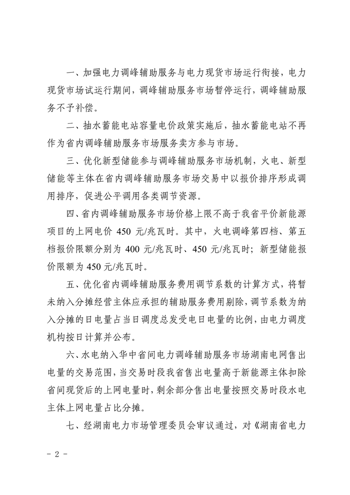 储能中国网获悉,10月17日,国家能源局湖南监管办公室下发关于明确湖南省电力辅助服务市场有关事项的通知。其中表示,优化新型储能参与调峰辅助服务市场机制,火电、新型储能等主体在省内调峰辅助服务市场交易中以报价排序形成调用排序,促进公平调用各类调节资源。 通知指出,省内调峰辅助服务市场价格上限不高于我省平价新能源项目的上网电价 450元/兆瓦时。其中,火电调峰第四档、第五档报价限额分别为400元/兆瓦时、450元/兆瓦时;新型储能报价限额为 450 元/兆瓦时。