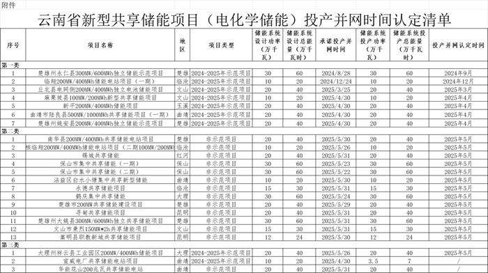 储能中国网获悉,11月25日,云南省能源局发布关于印发新型共享储能项目(电化学储能)投产并网时间认定清单的通知。根据项目清单,本次涉及23个新型共享储能项目认定并网时间,投产并网规模4.355GW/8.71GWh。 通知表示,此次新型共享储能项目(电化学储能)投产并网时间认定结果分为三类。 第一类为《实施方案》中明确的电化学储能项目(压缩空气储能项目除外)在2025年4月30日前投产并网的项目;共有7个项目,投产并网规模为1.3GW/2.6GWh。 第二类为《实施方案》以外满足电网并网条件,并在2025年5月31日前投产并网的电化学储能项目;共有13个项目,投产并网规模为2.62GW/5.24GWh。 第三类为不能认定为“《实施方案》中明确的电化学储能项目(压缩空气储能项目除外)在2025年4月30日前投产并网的,以及《实施方案》以外满足电网并网条件,并在2025年5月31日前投产并网的电化学储能项目”范围内的其他项目;共有3个项目,投产并网规模为0.435GW/0.87GWh。 原文如下: 云南省能源局关于印发新型共享储能项目(电化学储能)投产并网时间认定清单的通知 云南电网有限公司、昆明电力交易中心、有关电力企业: 按照《云南省发展和改革委员会 云南省能源局关于印发〈云南省新型储能发展实施方案(2024—2025年)〉的通知》(云能源科技〔2024〕98号)(以下简称《实施方案》)、《云南省发展和改革委员会 云南省能源局关于进一步推进新型共享储能发展的通知》(云能源科技〔2025〕1号)、《云南省电化学储能项目投产并网时间技术认定指南(试行)》《云南省能源局关于开展新型共享储能项目(电化学储能)投产并网时间认定的通知》(云能源办科技〔2025〕136号)等要求,省能源局会同有关单位开展了新型共享储能项目(电化学储能)投产并网时间认定工作。 一、投产并网时间认定分类 此次新型共享储能项目(电化学储能)投产并网时间认定结果分为三类。第一类为《实施方案》中明确的电化学储能项目(压缩空气储能项目除外)在2025年4月30日前投产并网的项目。第二类为《实施方案》以外满足电网并网条件,并在2025年5月31日前投产并网的电化学储能项目。第三类为不能认定为“《实施方案》中明确的电化学储能项目(压缩空气储能项目除外)在2025年4月30日前投产并网的,以及《实施方案》以外满足电网并网条件,并在2025年5月31日前投产并网的电化学储能项目”范围内的其他项目。 二、投产并网时间认定结果 投产并网时间认定结果详见附件《云南省新型共享储能项目(电化学储能)投产并网时间认定清单》。请云南电网公司、昆明电力交易中心按照有关文件做好清算等工作。 附件 云南省新型共享储能项目(电化学储能)投产并网技术认定情况清单 .xlsx 云南省能源局 2025年11月24日