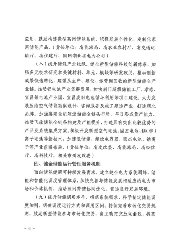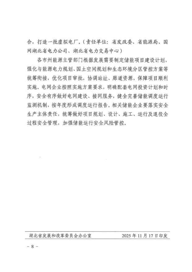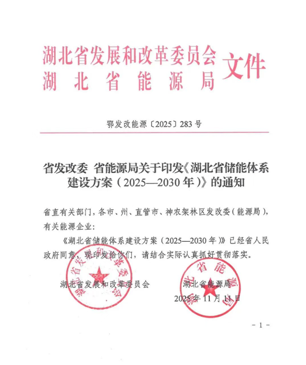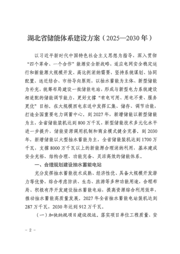 储能中国网获悉,近日,湖北省发改委、省能源局联合印发《湖北省储能体系建设方案(2025—2030年)》。方案指出,到2027年,新增储能以新型储能为主,全省储能装机达到800万千瓦,新型储能技术多元化水平进一步提升,储能资源调用机制和商业模式健全完善。到2030年,新增储能以大型抽水蓄能为主,全省储能装机达到1700万千瓦,支撑8000万千瓦以上的新能源合理消纳利用,基本建成安全充裕、结构合理、功能完备、灵活高效的储能体系。 方案提出,2027年全省抽水蓄能电站装机达到287万千瓦,2030年达到912万千瓦。2027年全省新型储能装机达到500万千瓦,2030年达到800万千瓦。 方案表示, 合理布局电网侧新型储能。在电网关键节点,结合系统运行需求优化电力输、配环节新型储能发展规模和布局,鼓励建设充放电时长4小时以上的压缩空气、液流等储能电站,更好发挥调峰、调频等多种调节功能。在偏远地区和输变电站址资源紧张地区,合理建设电网侧储能,适度替代输变电设施,提升电网末端供电能力。加快推进构网型储能在高比例新能源电网、弱电网及孤岛电网的应用。支持大容量飞轮储能电网调频应用。 灵活发展用户侧新型储能。引导工业园区、工商业企业、数据中心、算力中心、通信基站、公路服务区等对供电可靠性、电能质量要求高和用电量大的用户,按需配置高安全性锂电池、液流电池等不同时间尺度新型储能,提高用电可靠性、降低用电成本。探索不间断电源、电动汽车等用户侧储能设施建设,推动电动汽车通过有序充电、车网互动、换电模式等多种形式参与电力系统调节,挖掘用户侧灵活调节能力。 深入推进试点工作。推动固态电池在便携式储能、工商业用户储能等领域试点验证,加快推进新型储能产学研用深度融合,组织开展飞轮储能、钠离子电池、波流电池、压缩空气等新型储能电站试点。鼓励重力储能、熔盐储能、超级电容、超导储能、氢储能、固态电池等技术创新应用。积极推进国家车网互动规模化应用试点,推动长江绿色智能船舶充换电一体化试点依托大数据、云计算、人工智能等前沿技术,开展一批技术领先、应用前景好、可复制性强的新型储能应用试点。 完善储能价格机制。落实国家抽水蓄能两部制电价政策,逐步健全抽水蓄能容量电价政策。支持电源侧储能与新能源场站一体运营,优化输配电价政策。优化分时电价机制,不断完善电力中长期市场、现货市场价格机制,优化峰谷价差,健全新型储能参与电能量市场和辅助服务市场规则体系,探索建立电网侧储能容量补偿机制,容量电费纳入系统运行费用。完善新型储能应急调用价格机制,推动新型储能与各类分散式负荷资源聚合,打造一批虚拟电厂。 原文如下: