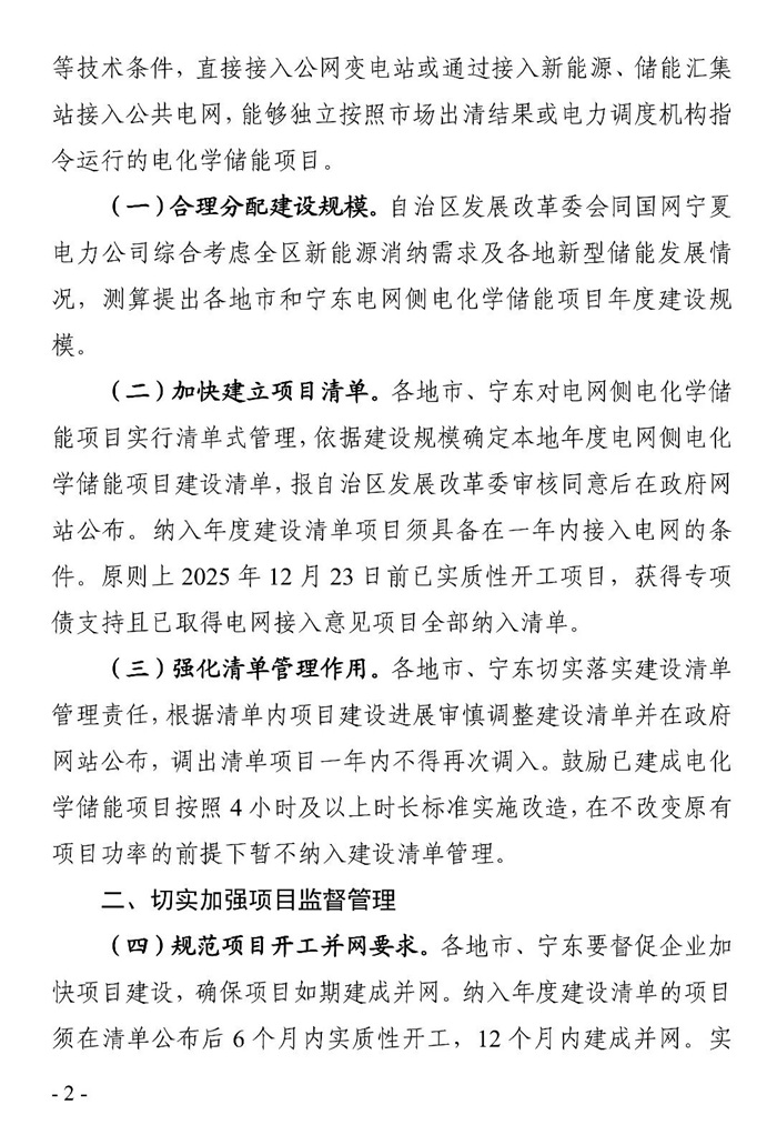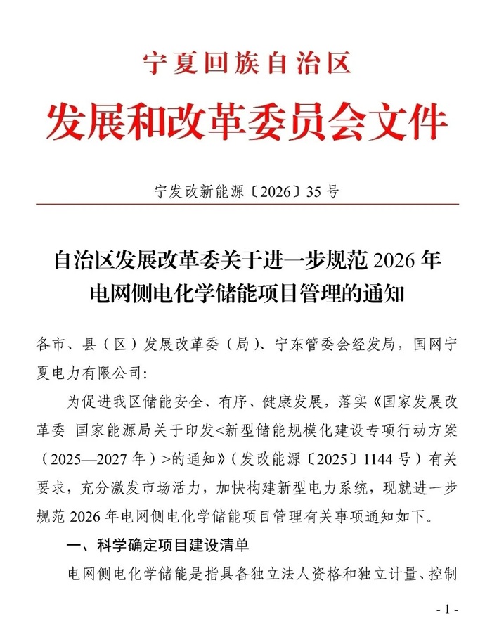 储能中国网获悉,2026年1月20日,宁夏自治区发改委发布关于进一步规范2026年电网侧电化学储能项目管理的通知。其中通知指出,已备案的电源侧储能项目,原则上暂不允许转为电网侧储能项目。 通知表示,加快建立项目清单。各地市、宁东对电网侧电化学储能项目实行清单式管理。纳入年度建设清单项目须具备在一年内接入电网的条件。原则上2025年12月23日前已实质性开工项目,获得专项债支持且已取得电网接入意见项目全部纳入清单。 纳入年度建设清单的项目,须在清单公布后的6个月内实质性开工,12个月内建成并网。电化学储能项目电网接入意见有效期1年,逾期未并网自动废止,电网间隔等资源同步收回。清单内项目在接入意见到期前2个月内可办理复核延期,延期后再次到期的原则上不再予以复核。 文件强调,坚决杜绝项目倒卖。在项目建成并网前,项目单位不得以任何方式转让、买卖项目开发权,严禁变更开发主体和股权,不得擅自变更建设规模及内容。对于违反要求的项目开发主体,取消其后续纳入清单资格。 通知表示,原则上2025年12月23日前已实质性开工项目,获得专项债支持且已取得电网接入意见项目全部纳入清单。各地市、宁东切实落实建设清单管理责任,根据清单内项目建设进展,调整建设清单,并在政府网站公布,调出清单项目一年内不得再次调入。 鼓励已建成电化学储能项目按照4小时及以上时长标准实施改造,在不改变原有项目功率的前提下暂不纳入建设清单管理。 原文如下: