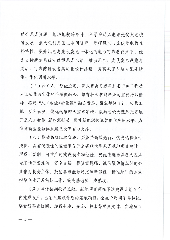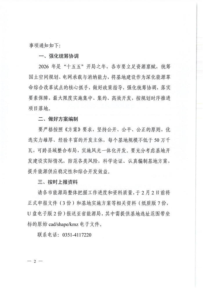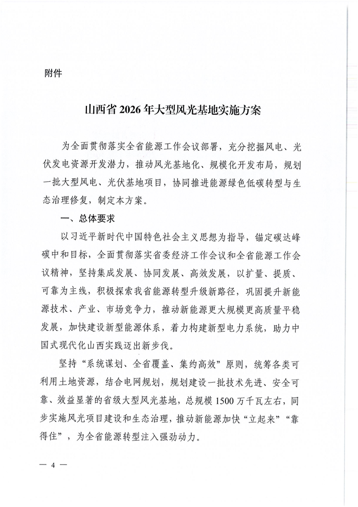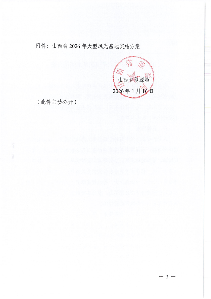 储能中国网获悉,近日,山西省能源局发布关于印发《山西省2026年大型风光基地实施方案》的通知。通知表示,为全面贯彻落实全省能源工作会议精神,充分挖掘山西省风电、光伏发电资源开发潜力,高质量做好项目规划布局,探索能源转型升级新路径,规模化、集约化、一体化推进全省域风光基地建设,协同保障能源安全与低碳转型,重点在资源富集区规划一批省级大型风光基地,山西省能源局编制了《山西省2026年大型风光基地实施方案》。 实施方案表示,鼓励风电与光伏一体化开发,结合风光资源、地形地貌等条件,科学推动风电与光伏发电统筹发展,最大化利用国土空间资源,发挥风电与光伏发电的互补特性,提升风电与光伏发电一体化的电力可靠替代水平。优先支持新建系统友好型风光电站,推动风电、光伏发电设施与灵活、可靠储能设备集成化设计建设,提高风光与站内配建储能一体化调用水平。 实施方案指出,坚持“系统谋划、全省覆盖、集约高效”原则,统筹各类可利用土地资源,结合电网规划,规划建设一批技术先进、安全可靠、效益显著的省级大型风光基地,总规模1500万千瓦左右,同步实施风光项目建设和生态治理,推动新能源加快“立起来”“靠得住”,为全省能源转型注入强劲动力。 深化集约高效开发。按照集中连片布局和规模化基地化建设思路,聚焦资源富集区,实施规模化、集约化布局。坚持"两个集中”,一是资源集中,持续推进单个县或跨县域资源整合,规划布局规模50万千瓦以上的省级风光基地项目;二是投资主体相对集中,支持各市优选1-2家企业开展深度合作,鼓励生产经营模式创新,支持其打造综合能源服务新业态,切实提升开发效益和综合竞争力。 实施方案要求,确保按期投产达效。基地项目须在下达建设计划2年内建成投产。已纳入建设计划的基地项目,全生命周期不得转让。 原文如下: