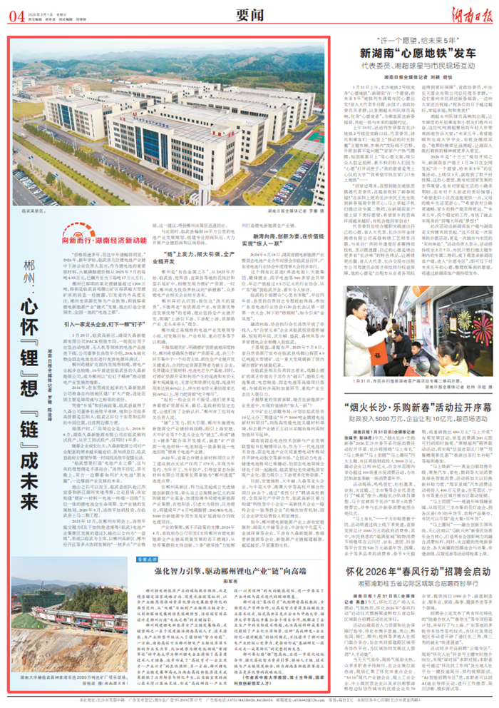 “价格低迷多年,但这半年涨幅很明显。”2026年,新年伊始,临武县几位锂电池产业链中下游企业负责人直言,作为锂电池的重要原材料,六氟磷酸锂价格从2025年7月的每吨4.93万元,已飙升至当下每吨17万元左右。 郴州已探明的氧化锂储量超过1200万吨,特别是临武县鸡脚山矿区探获超大型锂矿床的消息一经披露,引发省内外高度关注。郴州变资源优势为产业胜势,积极探索锂电新能源产业“链式”发展,提出打造全省领先、全国一流的“电池之都”。 临武高新区。 湖南日报全媒体记者 罗徽 摄 引入一家龙头企业,钉下一颗“钉子” 1月29日,临武高新区,湖南久森新能源有限公司PACK组装车间,一批批应用于应急启动电源、无人机等领域的电池产品接连下线。公司董事长汤欣平介绍,20A/h硫化物全固态电池也在进行充放电循环测试。 郴州的锂矿在国内发现得较晚,锂电产业起步也较晚。10年前进驻临武县的久森新能源公司,成为郴州以“钉钉子精神”推动锂电产业发展的缩影。 2016年,在东莞成长起来的久森新能源公司准备在内陆地区建厂扩大产能,选址范围主要是湖南或与之相邻的省份。 凭借“乡情”和招商政策,临武县赢得了久森公司董事长汤欣平青睐。他和公司很多高管都是岳阳人,临武正好位于东莞和岳阳的中间位置,往返两边都方便。 刚落户时,厂房周边全是山头。2018年8月,湖南久森新能源有限公司在临武顺利试投产,从开工到试投产,仅用时1年多。 随着企业成长壮大,久森新能源公司对产业配套的需求越来越迫切。获知消息后,临武县政府主要领导第一时间找汤欣平促膝长谈。 “临武想要打造‘电池产业之都’,这与我的理想倒是不谋而合。”汤欣平回忆,那天晚上,双方一边聊着如何扩大电池“朋友圈”,一边擘画产业发展的未来。 他山之石可以攻玉。临武县组队赴江西宜春和浙江湖州实地考察,立足县情,决定构建“锂矿—材料—电池—终端—回收”五位一体的锂电池全生命周期、全产业链的发展格局。2020年9月,汤欣平加码投资,在临武县上马二期工程。 2021年12月,在郴州市两会上,汤欣平提交题为《关于加快推进湘粤(临武)电池产业集聚区发展的建议》,提出以全市为“一盘棋”,形成以临武为主体,以郴州高新区、郴州经开区等多点协同发展的“一核多点”产业格局。这一建议,得到郴州决策层迅速回应。 与此同时,临武县编制10平方公里的电池产业发展规划,组建专业招商队伍,大力开展产业链招商和以商招商。 “链”上发力、招大引强,全产业链开发 湖南大中赫临武县神家湾年选2000万吨选矿厂项目现场。 徐杨政 摄(湖南图片库) 郴州是“有色金属之乡”。从2022年开始,临武县、桂阳县、宜章县等地的花岗岩和萤石尾矿中,相继发现含锂矿产资源。一时间,郴州成为投资界热议的“新锂都”,众多锂电产业相关企业纷至沓来。 郴州深切认识到:接住这“泼天的富贵”,不能再走“有资源没产业、有资源优势没发展优势”的老路,理应坚持全产业链开发,明确“上游引下游、下游配上游,资源换产业、龙头来牵头”理念。 郴州成立高规格的电池产业发展领导小组,对发展目标、产业布局、重点任务等予以明确。 不搞低端卖矿,明确锂矿资源就地深度转化。郴州希望确保含锂矿产资源采、选、冶三个环节集中于一个经营主体,抓住全产业链开发关键重点,合同约定资源获得者为链主企业,负责建设正极材料、电池电芯生产基地。同时,对锂矿资源开采和利用产生的尾渣和有价元素实现减量化、无害化和资源化处理,尾渣利用率达到80%以上,伴生的有价元素回收率达到60%以上,努力把资源“吃干榨尽”。 “起初一些企业并不接受,他们更多是奔着锂矿资源而来。最后,是政府的坚定态度,让他们有了全新认识。”郴州市工信局有关负责人说。 “链”上发力,招大引强。郴州实施锂电新能源全产业链招商战略,招引上海安能、大中矿业等7个龙头企业为“链主”,形成“链主+链条”联合体开发模式,涵盖“矿产资源—电池材料—电池制造—装备制造—电池回收”锂离子电池产业链。 2022年,宜章志存锂业新材料项目从开工建设到点火试产仅用了179天,实现当年签约、当年开工、当年投产,引得宜章志存新材料有限公司董事长蒋章铭为“郴州速度”连连点赞。 在郴州高新区,科力远发起成立先进储能创新联合体,牵头设立总规模20亿元的深圳储能产业基金,加速抢滩布局锂电新能源产业集群。在桂阳县,引进大为股份、汉尧锂业,将建成年产6万吨碳酸锂、20GWh电池、5000台新能源专用车及尾矿尾渣综合回收处理项目。 产业的集聚,离不开政策的支撑。2024年4月,省政府办公厅印发《支持郴州市锂电新能源全产业链高质量发展的若干措施》,从培育集群到支持创新,十条“硬举措”力挺郴州打造锂电新能源全产业链。 融湾向海、创新为要,在价值链实现“惊人一跃” 2024年6月18日,湖南省锂电新能源产业暨固态电池产业合作对接会在临武县召开,广东省电池行业协会年度理事大会同步举行。 这个拥有比亚迪(弗迪电池)、天能集团、赣锋锂业、南孚电池等940多家会员单位、年总产值超过3.5万亿元的行业协会,从广东“跑”到临武开会,着实令人惊讶。 临武的干部群众“心里有本账”。早在四年前,县里的负责同志专程赶赴珠海,参加广东省电池行业协会G20会长会议