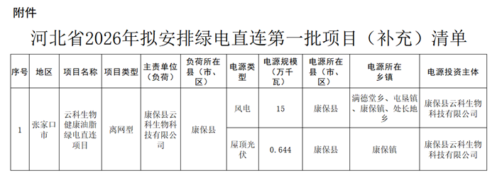 河北省2026年绿电直连拟安排第一批项目情况补充公示 根据省发展改革委《关于组织开展绿电直连项目申报工作的通知》(冀发改能源〔2025〕879号)要求,经各市组织上报、电网公司对接入条件确认及第三方咨询单位对项目建设方案评审,我委于2026年2月6日公示了2026年绿电直连拟安排第一批项目。按照张家口市最新提供的项目用地等支撑文件,云科生物健康油脂绿电直连项目已取得评审意见,现予以补充公示。 本次公示项目共1个、15.644万千瓦。 公示时间为2026年2月8日至2月12日。 公示期间,任何单位和个人可对公示内容提出书面异议。相关材料应注明真实姓名和联系方式,提出异议的单位或个人应对相关材料的真实性和可靠性负责。对匿名或无具体事实依据的异议、相关不正当要求不予受理。 电子邮箱:nyjxnyc@hbdrc.gov.cn 附件:河北省2026年拟安排绿电直连第一批项目(补充)清单 河北省发展和改革委员会 2026年2月8日