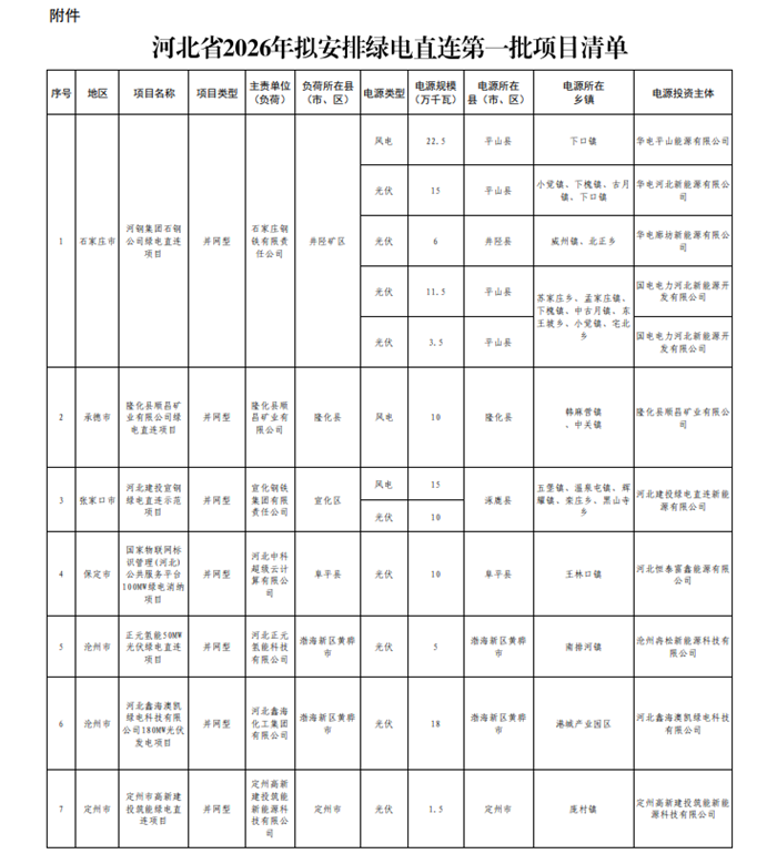 储能中国网获悉,日前,河北省发改委先后发布《河北省2026年绿电直连拟安排第一批项目情况公示》、《河北省2026年绿电直连拟安排第一批项目情况补充公示》。公告显示,河北省2026年绿电直连第一批项目共8个(拟安排项目7个、规模1280MW,补充公示项目1个、规模156.44MW。),本批次共1.436GW,其中,风电625MW,光伏811.44MW。 从业主来看,华电集团获取新能源建设指标最多,为435MW;河北建投次之,获取新能源建设指标250MW。 2015年12月31日,河北省发改委发布《关于下达河北省2025年绿电直连项目的通知》,下达全省绿电直连项目共31个,规模4.15GW,其中,风电2.54GW,光伏1.62GW。截止目前,河北省已下发绿电直连项目指标共计5.589GW,其中风电3.16GW,光伏2.43GW。 原文如下: 河北省2026年绿电直连拟安排第一批项目情况公示 根据省发展改革委《关于组织开展绿电直连项目申报工作的通知》(冀发改能源〔2025〕879号)要求,经各市组织上报、电网公司对接入条件确认及第三方咨询单位对项目建设方案评审,现对已取得评审意见和电网公司支持意见的项目予以公示。 本次公示项目共7个、128万千瓦。 公示时间为2026年2月6日至2月10日。 公示期间,任何单位和个人可对公示内容提出书面异议。相关材料应注明真实姓名和联系方式,提出异议的单位或个人应对相关材料的真实性和可靠性负责。对匿名或无具体事实依据的异议、相关不正当要求不予受理。 电子邮箱:nyjxnyc@hbdrc.gov.cn 附件:河北省2026年拟安排绿电直连第一批项目清单 河北省发展和改革委员会 2026年2月6日