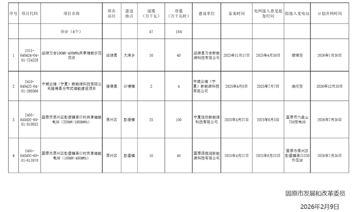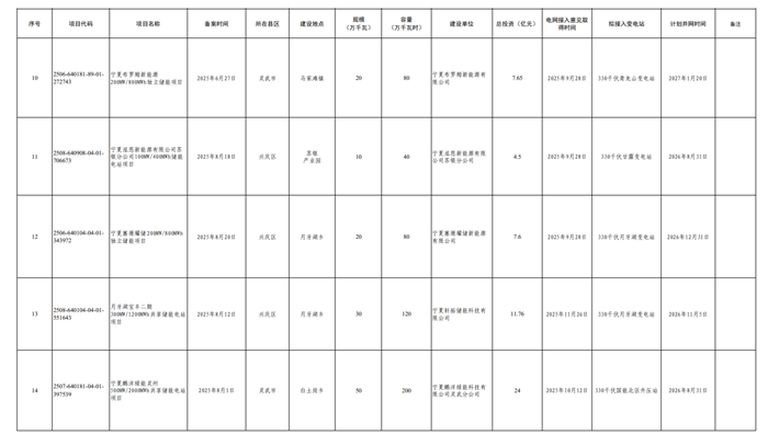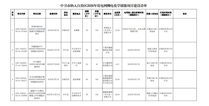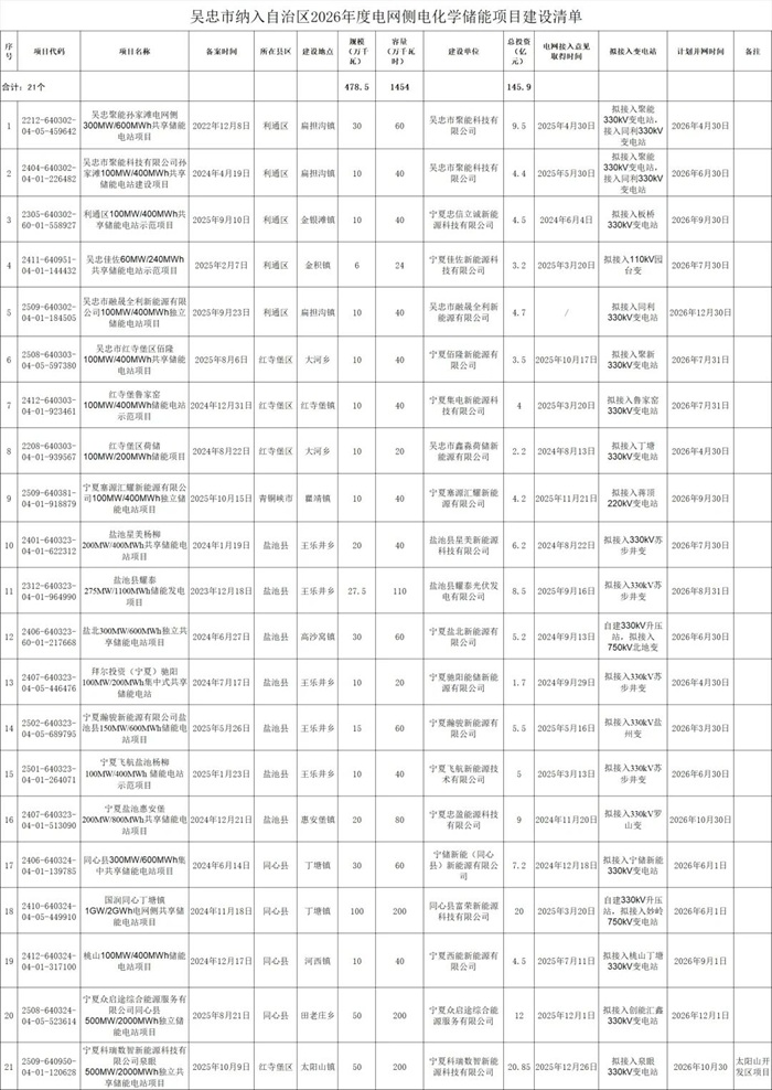 储能中国网获悉,日前,宁夏吴忠市、中卫市、固原市、银川市四地分别发布了纳入自治区2026年度电网侧电化学储能项目建设清单的公示。根据公示项目清单,4个区域共纳入2026年度电网侧储能项目建设45个,总规模约为11.04GW/32.67GWh。 其中,吴忠市纳入21个项目,规模为4.785GW/14.54GWh; 中卫市纳入6个项目,规模3.38GW/8.16GWh; 固原市纳入4个项目,规模470MW/1.84GWh; 银川市纳入14个项目,规模2.4GW/8.13GWh。 具体项目详情如下: