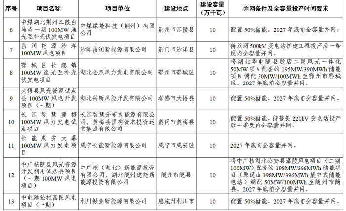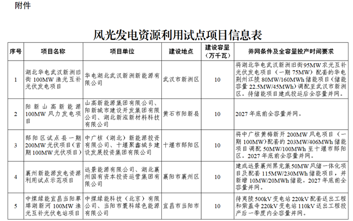 储能中国网获悉,3月16日,湖北省能源局发布关于加快推进风光发电资源利用试点项目的通知。通知表示,经企业申报、市县审核、接网校核,加快推进风光发电资源利用试点项目13个,容量130万千瓦。其中:风电项目8个,装机容量80万千瓦;光伏发电项目5个,装机容量50万千瓦。项目单位涉及华电、山高新能源集团、中广核、远景、中煤绿能等。 根据发布的项目信息,本次公布的13个项目中,有9个项目明确了储能配置规模,配储规模或超497.5MW。其中4个项目为此前的新能源配套储能项目的容量进行了异地调整,4个项目明确按照新能源装机比例50%配置储能,但未明确储能配置时长。 原文如下: 省能源局关于加快推进风光发电资源利用试点项目的通知 有关市(州)发改委(能源局),国网湖北省电力有限公司: 根据《省发改委 省能源局关于印发湖北省加强风光发电资源利用试点方案的通知》(鄂发改能源〔2025〕103号)和《省能源局关于推进新能源发电项目建设的通知》(鄂能源新能〔2025〕50号),现就加快推进风光发电资源利用试点项目通知如下。 一、经企业申报、市县审核、接网校核,加快推进风光发电资源利用试点项目13个,容量130万千瓦。其中:风电项目8个,装机容量80万千瓦;光伏发电项目5个,装机容量50万千瓦。具体名单详见附件。 二、请有关市(县)能源主管部门深入推进加强风光发电资源利用试点建设,做好项目协调服务工作,指导项目单位进一步落实建设条件,依法依规办理相关手续。协调有关部门强化用地、用林等要素保障,及时解决项目推进中遇到的困难和问题,为项目建设创造良好条件。 三、请各项目单位科学安排项目建设时序,严格落实主体责任,加强项目建设安全管理,依法合规推进项目建设,确保按要求、按承诺建成投运。项目建成投运后,要及时完成建档立卡工作。 四、请国网湖北省电力有限公司及时办理试点项目电网接入方案批复,加快相关电网工程建设,支持项目尽早并网。 附件:风光发电资源利用试点项目信息表 湖北省能源局 2026年2月13日
