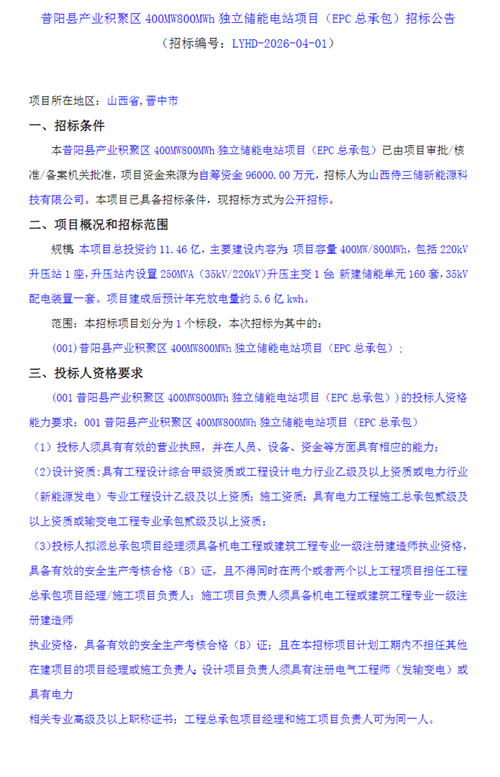 储能中国网获悉,2026年4月3日,山西昔阳县产业积聚区400MW/800MWh独立储能电站项目EPC发布招标公告,项目资金来源为自筹资金96000万元,合单价1.2元/Wh。招标人为山西侍三储新能源科技有限公司。 本项目总投资约11.46亿,主要建设内容为项目容量400MW/800MWh,包括220kV升压站1座,升压站内设置250MVA(35kV/220kV)升压主变1台:新建储能单元160套,35kV配电装置一套。项目建成后预计年充放电量约5.6亿kWh。 详见如下: