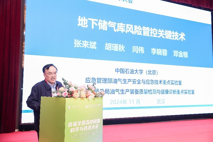 周创兵院士作主题报告 会议过程中,各与会院士先后作了提纲挈领的主题报告,杨春和院士分享了“深地储能的机遇与挑战”;孙金声院士介绍了“中国石油万米深地油气‘井工程’技术进展与展望”;康红普院士探讨了“深部煤炭地下空间开发及能源化低碳化利用”;李根生院士对“深层地热资源开采与储能”进行了深入剖析;张来斌院士分享了“地下储气库风险管控”的经验;周创兵院士带来了“岩体多场耦合理论与应用”的最新研究成果。专家学者围绕深地储能行业的热点问题和发展路径进行了深入探讨。 首日下午,臧中海主持了会议技术交流活动,中国科学院武汉岩土力学研究所陈卫忠研究员、中能建数字科技集团有限公司万明忠董事长、中国矿业大学(北京)鞠杨教授、国家管网集团储能技术有限公司李建君高级工程师、中国石油大学(北京)蒋官澄教授分别作会议报告。报告涉及深地储能领域的模型试验、数智方法、新型材料、工程实践及业务展望,内容详实,直面热点难点,引起现场热烈反响。 大会还就盐穴储能、人工洞室储能、多孔介质储能三种不同储能场景开设分会场专题讨论,现场氛围热烈,专家学者间不断碰撞出学术的火花。深地储能作为国家积极推动能源变革、构建新型能源体系的一项关键技术,不仅是能源科技的前沿课题,更是推动能源革命、保障国家能源安全的重要战略,对实现能源可持续发展具有深远意义。