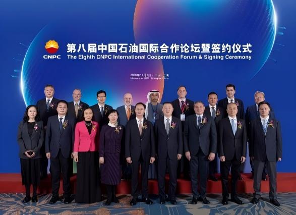 第八届中国石油国际合作论坛暨签约仪式上中外嘉宾合影。高景峰摄 备:全球能源巨头汇聚第八届中国石油国际合作论坛暨签约仪式 中国石油八届进博会累计签约 1447.85亿美元 |