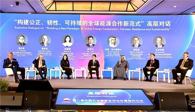 第八届中国石油国际合作论坛高层对话。金添摄 论坛还举办了高层对话环节,中国石油与来自壳牌集团、埃克森美孚、康菲、阿布扎比国家石油公司、标普全球等全球顶尖能源企业的领军者与资深业界专家,围绕“能源公正转型”“能源供应链韧性”“能源发展新动能”三大议题,通过开放的数据、丰富的案例和思想的碰撞,凝聚智慧与共识,谋求为全球能源合作的新范式找到最大公约数。