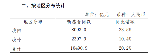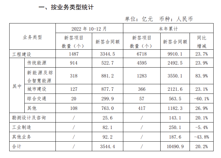 1月11日,中国能源建设股份有限公司公布2022年度主要经营数据公告。 公告显示,2022年中国能建共签约工程建设业务6718个,新签合同额9910.1亿元,同比增长23.7%。其中,签约新能源及综合智慧能源项目1283个,新签合同额3550.1亿元,同比增长83.9%。新能源及综合智慧能源业务包括风电、太阳能发电、生物质发电、综合智慧能源、储能、氢能、地热及其他新能源。2022年度中国能建总签约项目合同额达10490.9亿元,同比增长20.2%。 按地区分布统计,中国能建2022年在中国境内新签合同额8093亿元,同比增长23.5%,在境外新签合同额2397.9亿元,同比增长10.4%。 |