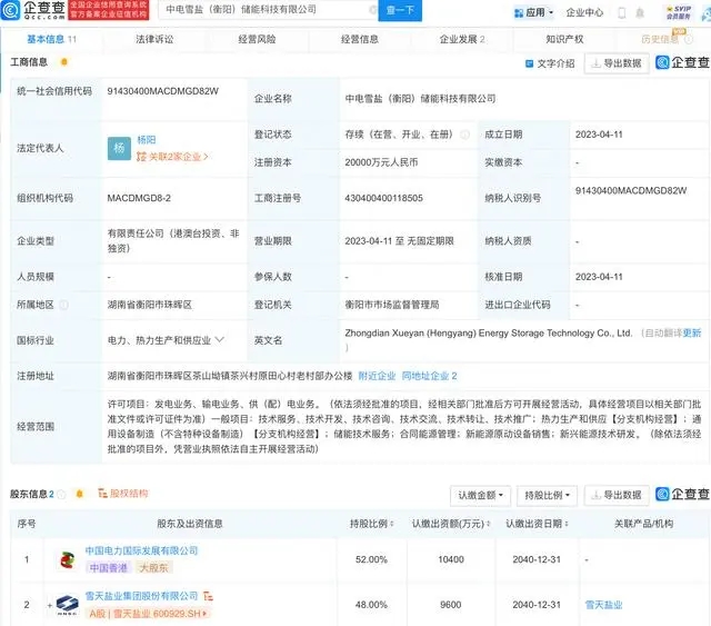 企查查APP显示,近日,中电雪盐(衡阳)储能科技有限公司成立,法定代表人为杨阳,注册资本2亿元人民币,经营范围包含:储能技术服务;合同能源管理;新能源原动设备销售;新兴能源技术研发等。企查查股权穿透显示,该公司由中国电力国际发展有限公司、雪天盐业(600929)共同持股。 |