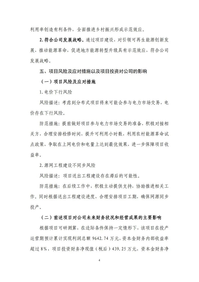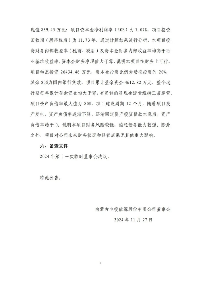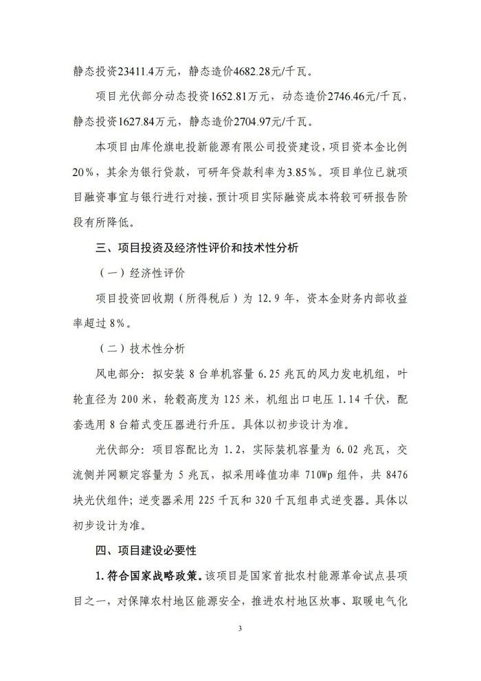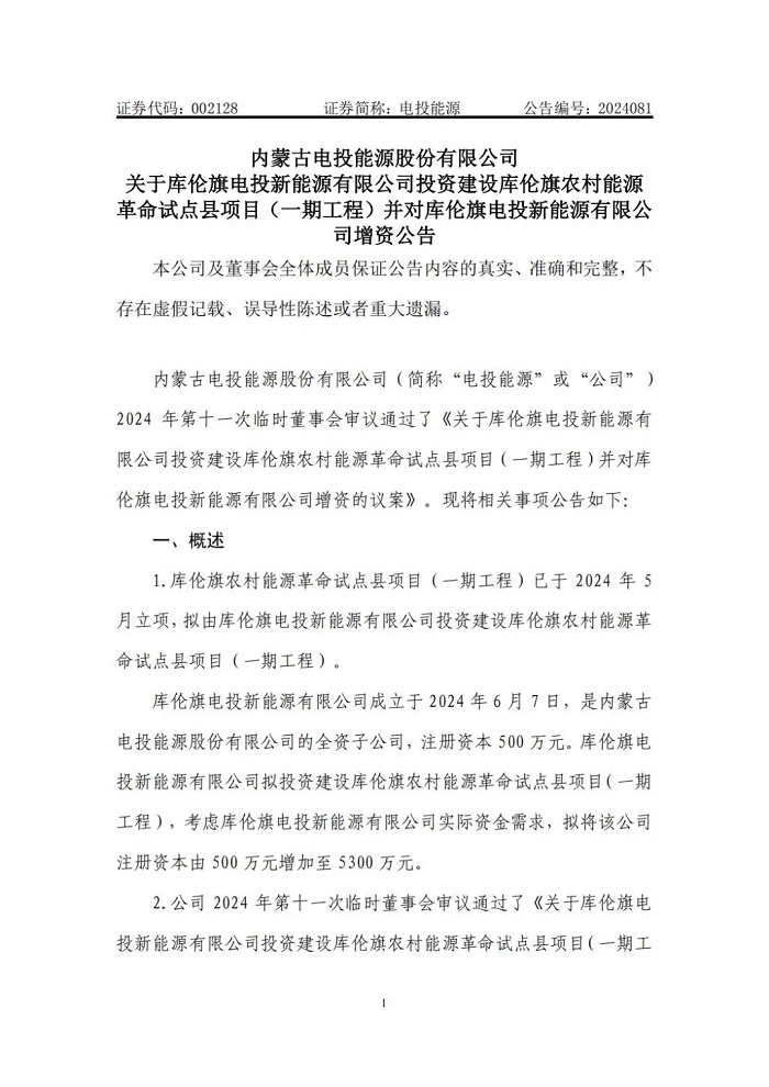 储能中国网获悉,11月29日,内蒙古电投能源股份有限公司发布公告称拟投资建设库伦旗农村能源革命试点县项目(一期工程),并对库伦旗电投新能源有限公司增资。 该项目为分布式新能源项目,项目总投资26602.52万元,建设规模60万千瓦,其中风电35万千瓦、光伏25万千瓦、配套建设集中电化学储能90MW/180MWh、乡村能源站等相关附属设施。 据了解,库伦旗农村能源革命试点县项目(一期工程)由库伦旗电投新能源有限公司直接负责。该公司成立于2024年6月7日,是内蒙古电投能源股份有限公司的全资子公司,此次公告表示拟将该公司注册资本由500万元增加至5300万元。 该项目作为内蒙古自治区唯一国家首批农村能源革命试点县项目,是实现通辽市库伦旗地方低碳转型绿色发展和乡村振兴的重点工程。本次拟履行一期工程投资决策程序,一期工程规划建设5万千瓦风电、0.5万千瓦光伏、1座66千伏升压站、1个乡村能源站,配套建设空气源热泵、新能源充电桩、光伏路灯等项目附属设施。建设于库伦旗库伦镇境内,场区距离库伦旗城区12公里,临近305省道、236县道,交通便利,能够满足重大件运输要求。 原文如下: |