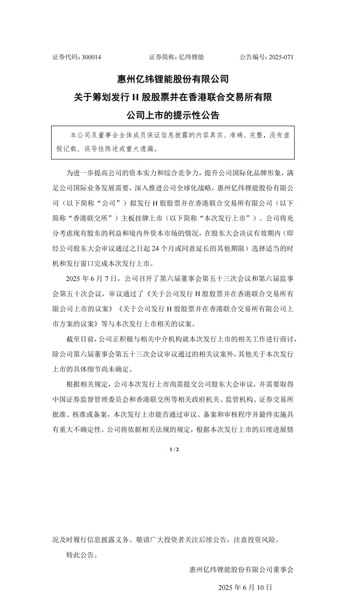 储能中国网获悉,6月9日晚间,惠州亿纬锂能股份有限公司发布关于筹划发行H股股票并在香港联合交易所有限公司上市的提示性公告。 公告表示,亿纬锂能将充分考虑现有股东的利益和境内外资本市场的情况,在股东大会决议有效期内(即经公司股东大会审议通过之日起24个月或同意延长的其他期限)选择适当的时机和发行窗口完成本次发行上市。 2025年6月7日,亿纬锂能召开了第六届董事会第五十三次会议和第六届监事会第五十次会议,审议通过了《关于公司发行H股股票并在香港联合交易所有限公司上市的议案》《关于公司发行H股股票并在香港联合交易所有限公司上市方案的议案》等与本次发行上市相关的议案。 截至目前,亿纬锂能正积极与相关中介机构就本次发行上市的相关工作进行商讨,除公司第六届董事会第五十三次会议审议通过的相关议案外,其他关于本次发行上市的具体细节尚未确定。 根据相关规定,亿纬锂能本次发行上市尚需提交公司股东大会审议,并需要取得中国证券监督管理委员会和香港联交所等相关政府机关、监管机构、证券交易所批准、核准或备案,本次发行上市能否通过审议、备案和审核程序并最终实施具有重大不确定性。 公告原文如下: