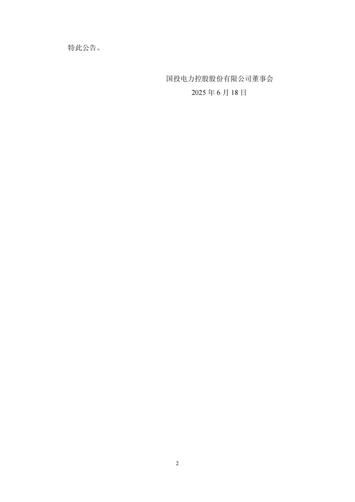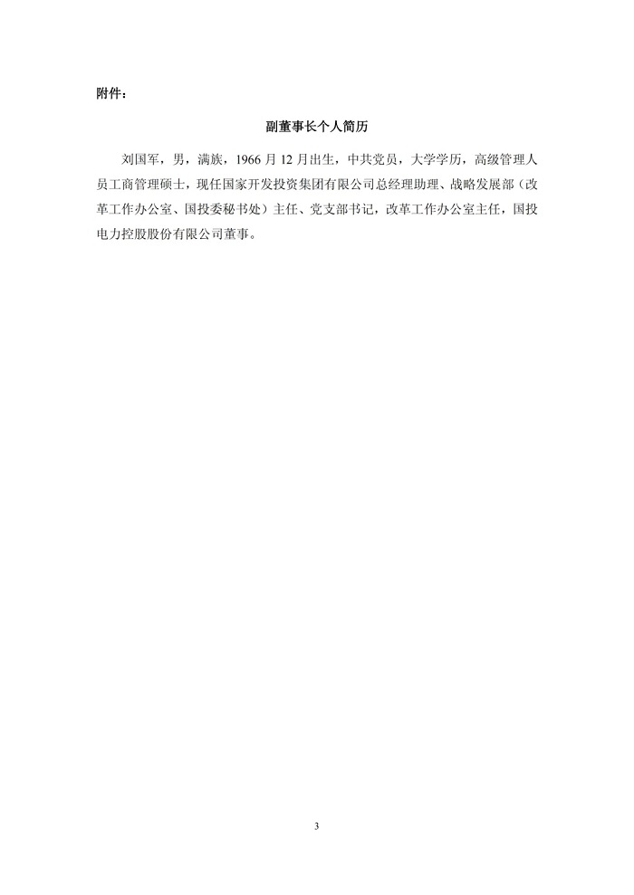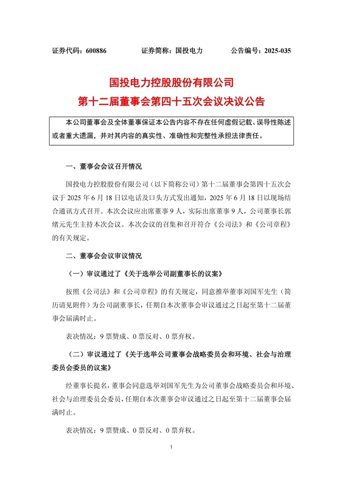 储能中国网获悉,6月18日,国投电力控股股份有限公司(以下简称“国投电力”)发布公告称,公司第十二届第四十五次董事会会议于2025年6月18日以现场结合通讯方式召开。会议审议了《关于选举公司副董事长的议案》等文件。 公告称,按照《公司法》和《公司章程》的有关规定,同意推举董事刘国军先生为公司副董事长,任期自本次董事会审议通过之日起至第十二届董事会届满时止。经董事长提名,董事会同意选举刘国军先生为公司董事会战略委员会和环境、社会与治理委员会委员,任期自本次董事会审议通过之日起至第十二届董事会届满时止。 附件: 副董事长个人简历 刘国军,男,满族,1966年12月出生,中共党员,大学学历,高级管理人员工商管理硕士,现任国家开发投资集团有限公司总经理助理、战略发展部(改革工作办公室、国投委秘书处)主任、党支部书记,改革工作办公室主任,国投电力控股股份有限公司董事。 公告原文如下: