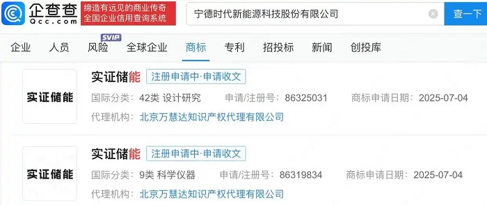 储能中国网获悉,查查APP显示,近期,宁德时代(300750)申请注册“实证储能”商标,国际分类为科学仪器、设计研究,当前商标状态均为注册申请中。