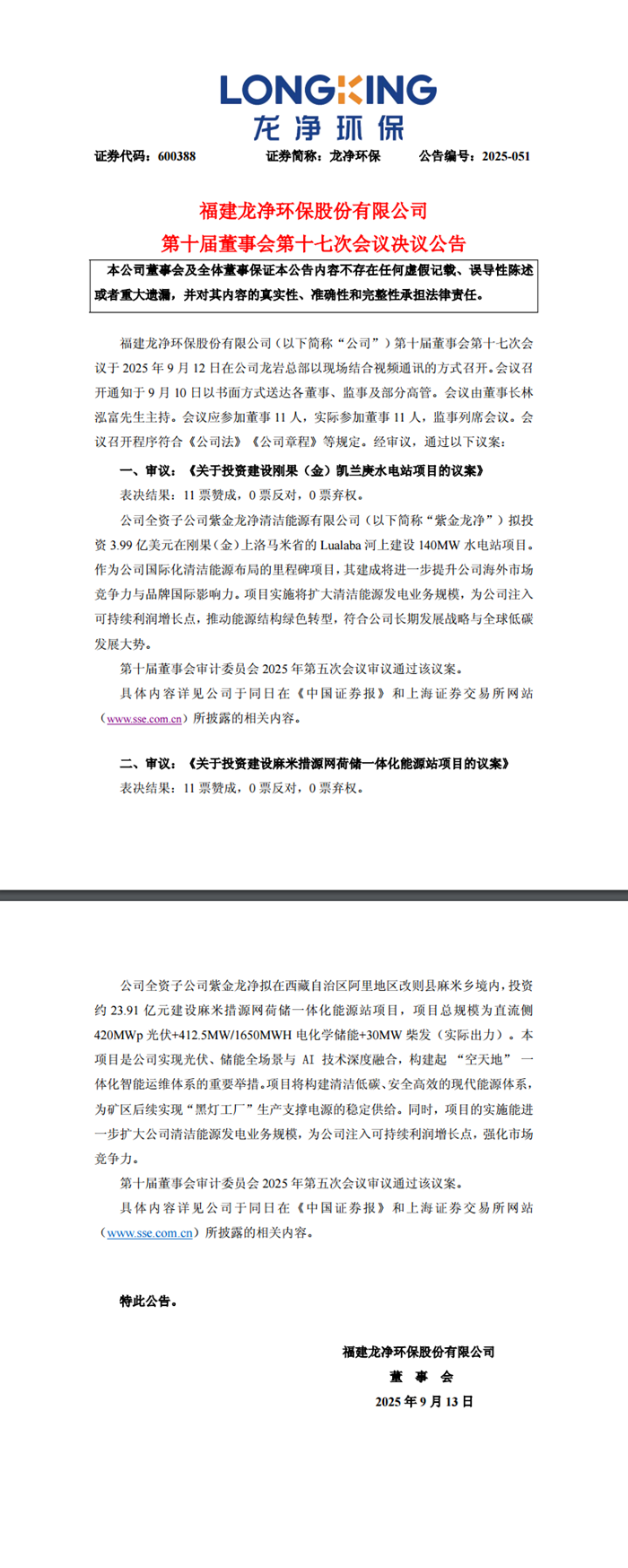 储能中国网获悉,9月12日,龙净环保发布公告称,公司审议通过《关于投资建设麻米措源网荷储一体化能源站项目的议案》。公告表示,公司全资子公司紫金龙净拟在西藏自治区阿里地区改则县麻米乡境内,投资约 23.91亿元建设麻米措源网荷储一体化能源站项目,项目总规模为直流侧420MWp光伏+412.5MW/1650MWh电化学储能+30MW 柴发(实际出力)。 本项目是公司实现光伏、储能全场景与 AI 技术深度融合,构建起 “空天地” 一体化智能运维体系的重要举措。项目将构建清洁低碳、安全高效的现代能源体系, 为矿区后续实现“黑灯工厂”生产支撑电源的稳定供给。同时,项目的实施能进一步扩大公司清洁能源发电业务规模,为公司注入可持续利润增长点,强化市场竞争力。 公告原文如下:
