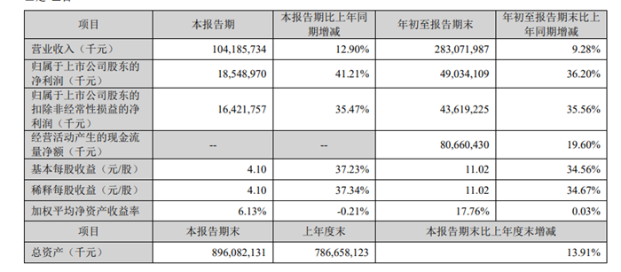 前三季度累计实现营业收入2830.72亿元,同比增长9.28%;归属于上市公司股东的净利润490.34亿元,同比增长36.20%。 来源:宁德时代公告 |