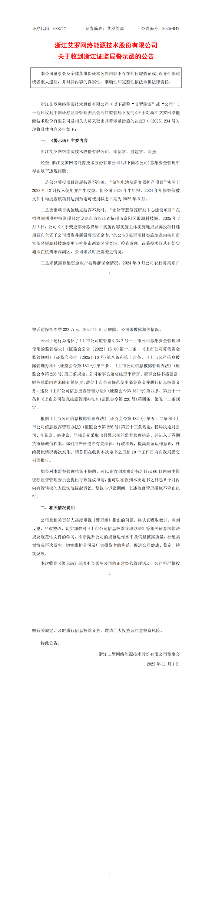 储能中国网获悉,11月1日,艾罗能源发布关于收到浙江证监局警示函的公告。 公告表示浙江艾罗网络能源技术股份有限公司(以下简称“艾罗能源”或“公司”)于近日收到中国证券监督管理委员会浙江监管局下发的《关于对浙江艾罗网络能源技术股份有限公司及相关人员采取出具警示函措施的决定》。根据公告内容,浙江证监局在检查中发现艾罗能源在募集资金管理及信息披露方面存在以下三项违规问题: 一是部分募投项目进展披露不准确。“储能电池及逆变器扩产项目”实际于 2023年12月投入使用并产生收益,但公司2024年半年报、2024年年报等信披文件中均披露该项目达到预定可使用状态日期为2022年6月。 二是变更项目实施地点披露不及时。“光储智慧能源研发中心建设项目”在招股说明书中披露项目建设地点为浙江省杭州市富阳区银湖科技城。2025年7月1日,公司《关于变更部分募投项目实施内容实施主体实施地点及募投项目延期暨向全资子公司增资并新设募集资金专户的公告》显示项目实施地点由杭州市富阳区银湖科技城变更为杭州市西湖区紫金港。检查发现,该募投项目从开始实施即在杭州市西湖区,公司未及时披露变更情况。 三是未披露募集资金账户被诉前保全情况。2024年9月公司农行募集账户被诉前保全冻结332万元,2024年10月解除。公司未披露相关情况。 浙江证监局决定对公司、李新富、盛建富、闫强分别采取出具警示函的监督管理措施,并记入证券期货市场诚信档案。艾罗能源需在收到本决定书之日起10个工作日内向浙江证监局提交书面报告。 原公告如下: