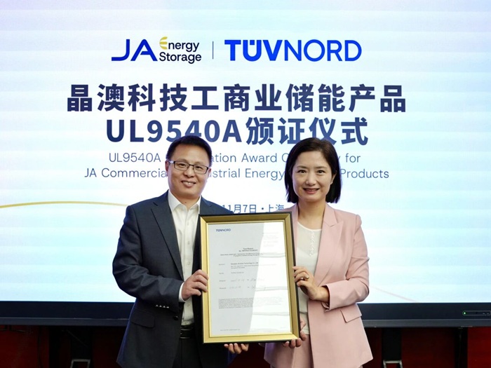 储能中国网获悉,11月7日,上海,晶澳科技工商业储能产品顺利通过了全球权威安全认证——UL 9540A:2025认证,并获得TÜV NORD颁发的国际权威认证报告。这一重要成果标志着晶澳科技在储能领域的技术实力与产品安全性能获得了国际权威机构的充分认可,进一步巩固了其在全球储能市场中的竞争优势。