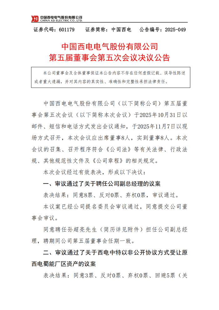 储能中国网获悉,11月7日,中国西电电气股份有限公司第五届董事会议以现场方式召开。审议通过了关于聘任公司副总经理的议案,同意聘任孙超亮先生担任公司副总经理,聘期同公司第五届董事会任期一致。 孙超亮先生,1979年出生,中共党员,高级工程师,河南科技大学控制工程专业硕士。历任许继集团有限公司营销服务中心总监、国网山东电力有限公司运检部副主任,河南许继仪表有限公司副总经理,许继集团有限公司市场部(营销服务中心)副主任,许继电气股份有限公司营销服务中心副总经理,河南许继仪表有限公司党委书记、副总经理,河南许继仪表有限公司总经理、党委副书记,许继电气股份有限公司副总经理、党委委员,河南许继仪表有限公司董事长、党委书记,许继电气股份有限公司副总经理、党委委员、纪委书记,河南许继仪表有限公司董事长、党委书记,中国西电集团有限公司党委常委、纪委书记,中国西电电气股份有限公司纪委书记、监事等职务。现任中国西电电气股份有限公司党委常委、副总经理。 原文如下: