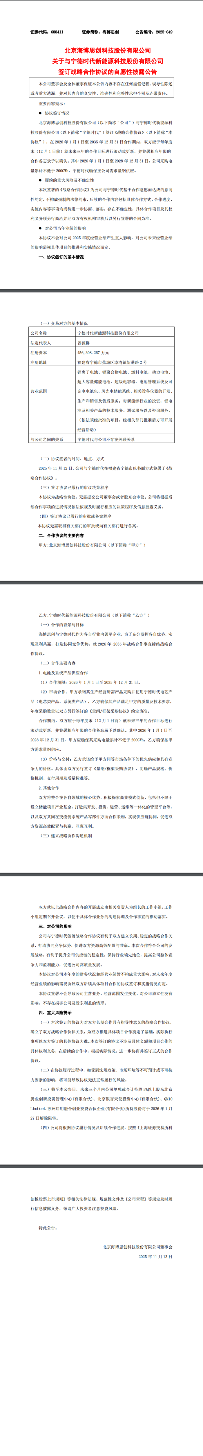 储能中国网获悉,11月12日,海博思创披露公告称,公司与宁德时代在福建省宁德市以书面方式签订《战略合作协议》,在2026年1月1日至2035年12月31日合作期内,双方应于每年度末(12月1日前)就未来三年的合作目标进行滚动式更新,并签署相应年限的合作备忘录予以确认。其中2026年1月1日至2028年12月31日,公司采购电量累计不低于200GWh,宁德时代确保按公司需求量纲供应。 本次签署的《战略合作协议》为公司与宁德时代基于合作意愿而达成的意向性约定,不构成强制的法律约束,后续的合作内容包括具体合作方式、合作进度、实施内容等事项均尚待进一步协商、落实,存在不确定性,具体合作项目及其权利义务须另行商洽并经双方有权机构审核后以另行签署的合同为准。 公告还提到,双方将整合在各自领域的核心优势,积极探索商业模式创新,包括但不限于 设立储能项目产业基金,打造集开发、投资、运营、运维等一体化的管理平台等, 以及双方共同在交流侧系统产品零部件方面合作采购,实现供应链协同,促进双方资源高效配置与共赢,互惠互利。 公告原文如下: