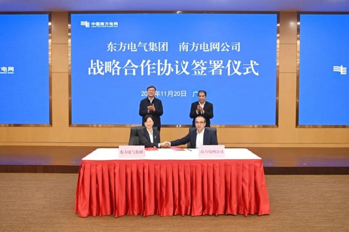 11月20日,南方电网公司与东方电气集团在广州签署战略合作协议。双方将贯彻落实“四个革命、一个合作”能源安全新战略,协同推进新型能源体系和新型电力系统建设,加快建设能源电力现代化产业体系,推动构建能源生态系统,共同推动能源领域装备、技术、服务和标准“走出去”。公司董事长、党组书记孟振平,东方电气集团董事长、党组书记罗乾宜共同见证签约。公司党组成员、副总经理吴小辰,东方电气集团党组成员、总会计师吕双代表双方签署协议。签约前,双方举行了会谈。