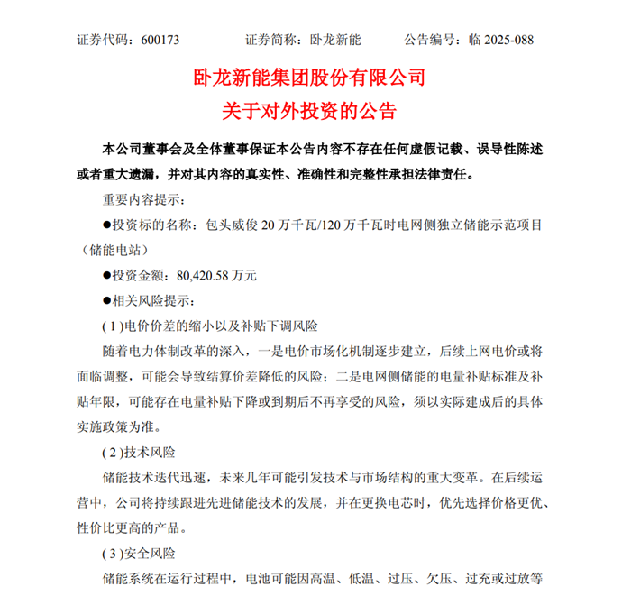 储能中国网获悉,12月1日晚间,卧龙新能披露公告称,公司同意通过下属公司包头威俊华腾新能源有限公司建设包头威俊20万千瓦/120万千瓦时电网侧独立储能示范项目,本项目计划总投资8.04亿元。
