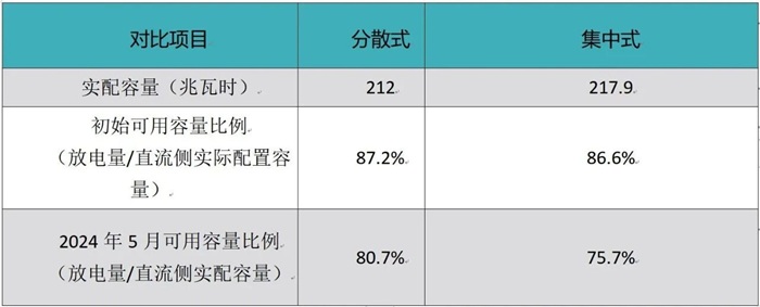 图1 单级功率变换的分散式电池储能系统架构 相较于集中式储能,分散式储能的核心优势在于实现了簇级独立控制,彻底解决了并联环流、“木桶效应”等痛点。系统对电池一致性要求降低,兼容性更强,运维操作得以简化,在容量可用率、循环寿命及整体安全性方面展现出显著优势,技术指标达到国际先进水平。 某省2021年同期建成的两座百兆瓦级储能电站规模均为100兆瓦/200兆瓦时,均采用同品牌280安时电池,但分别采用了分散式与集中式技术。经过近两年半的运行后,分散式电站的可用容量比例仍高出集中式5个百分点,凸显了分散式技术高可用容量的优势。对比情况如表1所示。