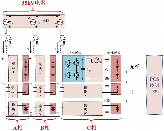 表1 两种技术路线的储能电站可用容量情况 由实测结果可知,分散式电站电池簇荷电状态(SOC)最大不平衡度为4.2%,远低于集中式电站的27%,表明分散式技术能通过簇间均衡控制有效维持SOC一致,使系统可用容量显著优于集中式方案。 在电池簇电流分布情况上,分散式电站中各电池簇电流分布均衡,而集中式电站则差异显著,尤其在充放电始末阶段。这种不均衡会导致簇间功率分配不均,加速电池老化和系统容量衰减。 清能院还自主研发了分散式储能专用的电池管理系统(BMS)、能量管理系统(EMS)和模块化PCS等关键设备,先后建成全球首座百兆瓦级分散式独立储能电站、全球首座百兆瓦级分散控制构网型储能电站、国内容量最大的单层站房式储能电站等多项标杆工程,彰显了清能院在行业技术发展中的引领地位。 (三)高压直挂式储能架构 尽管分散式储能有效解决了环流与“木桶效应”等问题,但在面向吉瓦时级超大规模储能电站建设时,仍面临单机容量有限、系统集成复杂度高、依赖工频变压器导致效率与稳定性受限、散热与防护矛盾突出等挑战。 为突破上述瓶颈,清能院于2021年成功牵头研制全球单机容量最大的35千伏/25兆瓦高压直挂储能系统。该系统采用级联H桥变换器拓扑,实现电池簇经功率单元逆变后串联形成高压,直接挂接35千伏电网,省去工频变压器环节。此举在显著提升单机容量、系统效率及响应速度的同时,延续了分散式架构对电池簇的精细化管理优势。