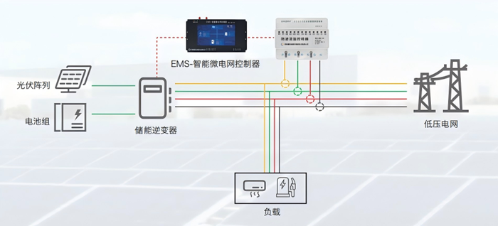 核心能力:快速响应与智能平衡 当电力波动或故障发生时,控制器毫秒级自动调整能源供应组合与运行参数,使供需瞬间重归平衡,显著增强微电网强健性,大幅降低停电风险与损失。 "源-储-荷-网"多源协同 智能调度光伏、风电、储能、柴发等异构设备:新能源出力波动时,储能快速充放电平抑波动;负荷突增时,自动启动备用电源补充功率,避免局部过载及电压/频率越限,实现全系统最优运行。 无缝并/离网切换 大电网正常时协同运行,响应调峰调谷等需求;电网故障时无缝切换至离网模式,持续保障关键负荷供电,提升供电可靠性与资产价值。 全协议兼容与云边协同 内置IEC 61850、Modbus等多协议解析能力,即插即用对接不同厂商设备。采用边缘计算实现本地快速决策,同时依托云端算力支撑全局优化,兼顾响应速度与整体效益。 4.防逆流表与光伏监控终端 防逆流表:专为储能系统打造,集双向测量、毫秒级数据传输于一体,体积小、易安装;实 时联动储能EMS微电网控制器,为储能EMS精准、实时防逆流控制提供高速交采数据 支撑,实现储能EMS实时能量调度。