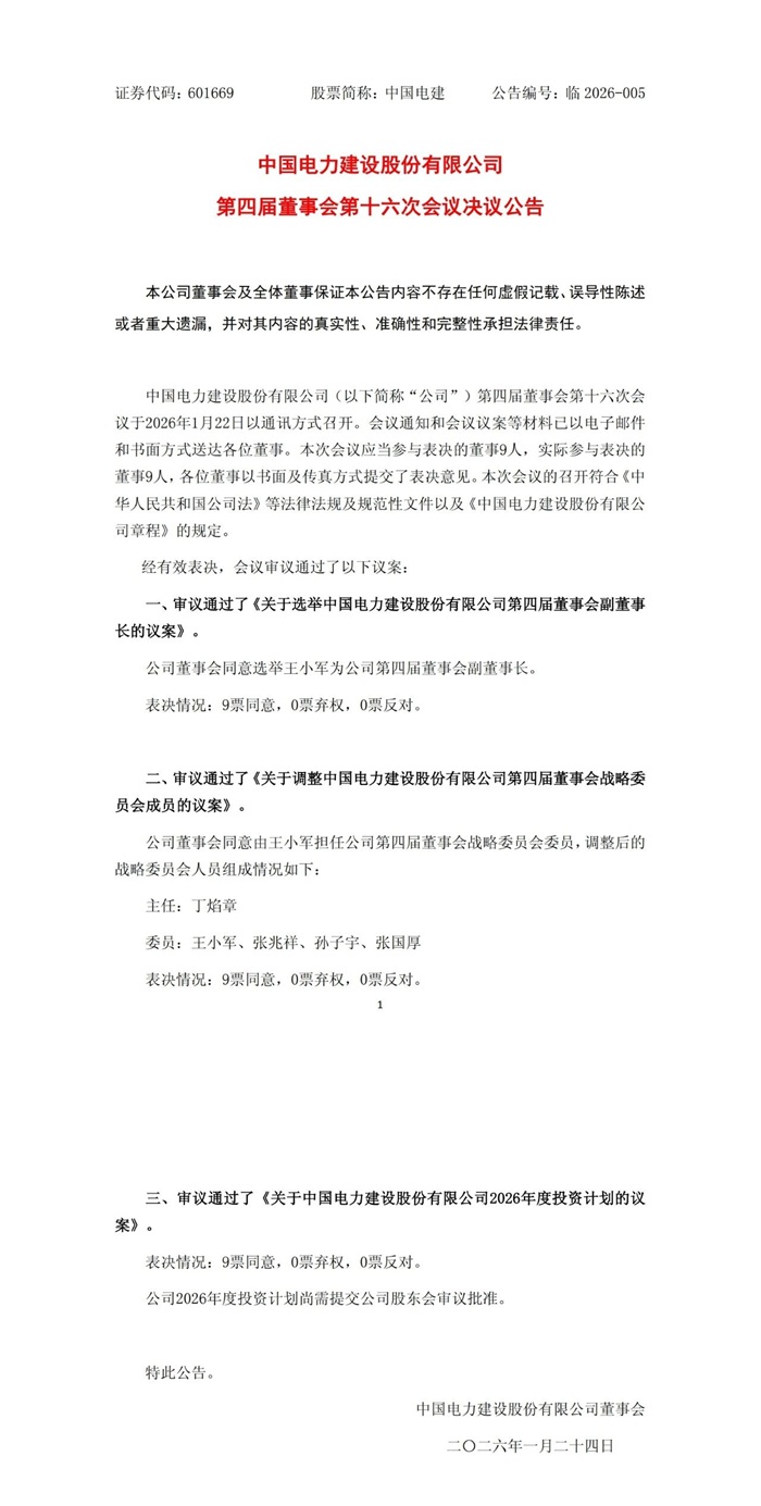 储能中国网获悉,1月24日,中国电力建设股份有限公司发布第四届董事会第十六次会议决议公告。公告表示,中国电力建设股份有限公司于1月22日召开第四届董事会第十六次会议。经有效表决,会议审议通过了《关于选举中国电力建设股份有限公司第四届董事会副董事长的议案》。公司董事会同意选举王小军为公司第四届董事会副董事长。 同时,会议审议通过了《关于调整中国电力建设股份有限公司第四届董事会战略委员会成员的议案》。公司董事会同意由王小军担任公司第四届董事会战略委员会委员,调整后的战略委员会主任为丁焰章,委员为王小军、张兆祥、孙子宇、张国厚。 公告原文如下: