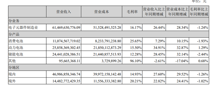 其中,储能电池营收244.4亿元,同比增长28.45%,营收占比39.76%。 储能电池毛利率12.28%,同比下降2.44个百分点。 动力电池出货50.15GWh,同比增长65.56%。 储能电池出货71.05GWh,同比增长40.84%。 拥有11个生产基地,产能296220万只,在建产能72031万只,产量260132万只,产能利用率87.82%。并规划新增约260GWh大铁锂产能。 已规划建设100MWh固态电池量产基地;规划年产能2GWh的亿纬钠能总部动工建设。 研发投入34亿元,占营业收入比例5.59%。 量产600Ah+储能电池 亿纬锂能的储能电池产品主要包括大方形电池、方形磷酸铁锂电池、圆柱铁锂电池、钠离子电池,同时也拥有电芯、模组、系统到BMS 全产品解决方案及用户侧储能智慧运营服务。储能电池产品主要应用在电力储能、工商业储能、户用储能、通信储能、数据中心备电和船舶动力等领域。 亿纬锂能着力推进“大方形+叠片”技术转型升级,成为全球首家量产600Ah+储能电池的企业。2022年10月,亿纬锂能率先发布628Ah超大容量电芯Mr. Big,于2024年12月实现投产。2025年,搭载628Ah大电池的独立储能电站投运,该电站装机容量400MWh,成功实现600Ah+储能大电池在百兆瓦时级项目部署。 另外,亿纬锂能已规划建设100MWh固态电池量产基地,龙泉系列固态电池产品已相继下线。 钠离子电池储能系统已投入运行,报告期内,亿纬钠能总部动工建设,项目规划年产能2GWh,将高效赋能储能及AIDC场景。 产能布局 亿纬锂能在全球拥有11个生产基地。其中,国内在惠州、湖北、江苏、四川、云南、浙江等地进行了产能布局;国外已在马来西亚建成电池生产基地,并积极推进匈牙利工厂项目的建设。 2025年,亿纬锂能产能296220万只,在建产能72031万只,产量260132万只,产能利用率87.82%。 亿纬锂能认为,全球储能行业将迎来高速增长期。基于市场需求,亿纬锂能规划新增约260GWh大铁锂产能,计划在广东省、湖北省、江苏省、福建省、浙江省等地进行考察,结合市场需求逐步落地。 研发投入34亿元,营收占比5.59% 2025年,亿纬锂能研发费用30亿元,同比增长2.16%。研发投入34亿元,占营业收入比例5.59%。 主要投向在固态电池项目、钠离子电池项目、AI机器人及智能制造项目、龙泉实验室及基础研发平台、超高功率特种电池技术项目。 |