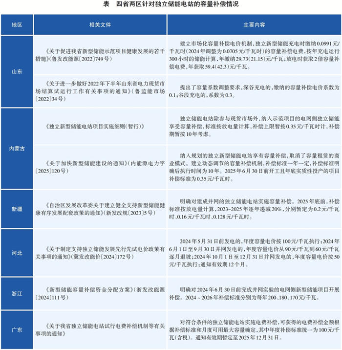 进一步完善独立储能容量电费补偿机制的相关建议 随着我国能源结构转型不断深化,以电化学储能为核心的新型储能技术广泛应用于电力系统各环节,发挥了重要调节性作用,对于保障电网安全运行、促进新能源开发消纳具有重大意义。根据国家能源局数据,截至2024年底,全国已建成投运新型储能项目累计装机规模达7376万千瓦/1.68亿千瓦时,装机规模逐步呈现集中式、大型化趋势,平均储能时长提高到2.3小时,年度等效利用小时数约1000小时。 独立储能定义及收益模式 独立储能电站是指具备调度直控条件,以独立市场主体身份直接与电力调度机构签订并网调度协议,不受接入位置限制,纳入电力并网运行及辅助服务管理,并按照其接入位置与电网企业和相关发电企业或电力用户等相关方签订合同,约定各方权利义务的储能电站。目前,独立储能电站主要通过“电能量(现货套利)、容量(容量电价+共享租赁)、电力辅助服务”三类价值渠道实现收益,收益水平主要受到价格及市场机制和政府补贴政策等因素的影响。 当前,少数省份出台了针对独立储能的容量补偿政策,一定程度上缓解了独立储能面临的盈利不足问题,但定价方式缺乏动态调整机制,不利于提升资源配置效率,难以支撑独立储能市场化可持续运作。随着《关于深化新能源上网电价市场化改革 促进新能源高质量发展的通知》(发改价格〔2025〕136号)明确取消新能源强制配储要求,独立储能既有的租赁收益受到较大影响,亟需加快建立长期稳定有效的容量电价机制,合理体现独立储能容量价值,支撑建立可持续的商业模式,推动行业健康发展。 独立储能容量电费补偿机制现状 国家及地方层面政策情况 近年来,国家层面相关文件多次提及新型储能价格机制建设,为地方相关政策制定提供顶层框架。2021年7月,国家发改委、国家能源局发布《关于加快推动新型储能发展的指导意见》(发改能源规〔2021〕1051号)明确要求健全新型储能价格,建立电网侧独立储能电站容量电价机制,逐步推动储能电站参与电力市场;2024年12月,国家发改委、国家能源局印发《电力系统调节能力优化专项行动实施方案(2025~2027年)》(发改能源〔2024〕1803号),再次强调加快建立市场化容量补偿机制,以市场为导向确定容量需求和容量价值,对有效容量进行合理补偿。 根据中央政策的相关要求,各地结合地区自身特点,推出了差异化的独立储能容量补偿政策,目前山东、内蒙古出台了相对市场化的长效容量补偿电价机制,新疆、河北和浙江等省区则通过政策文件明确了若干年内针对新型储能的容量补偿标准,广东就独立储能试行电费补偿机制征求意见(四省两区的补偿机制详见表)。