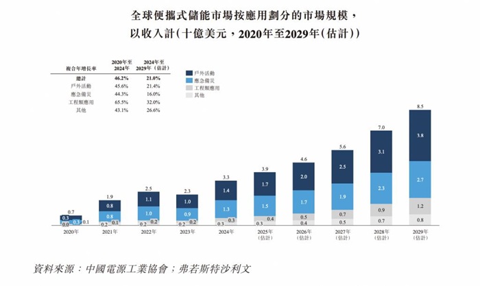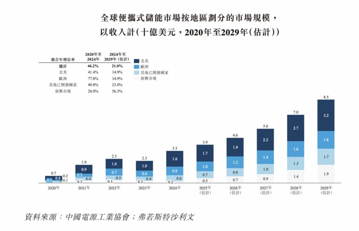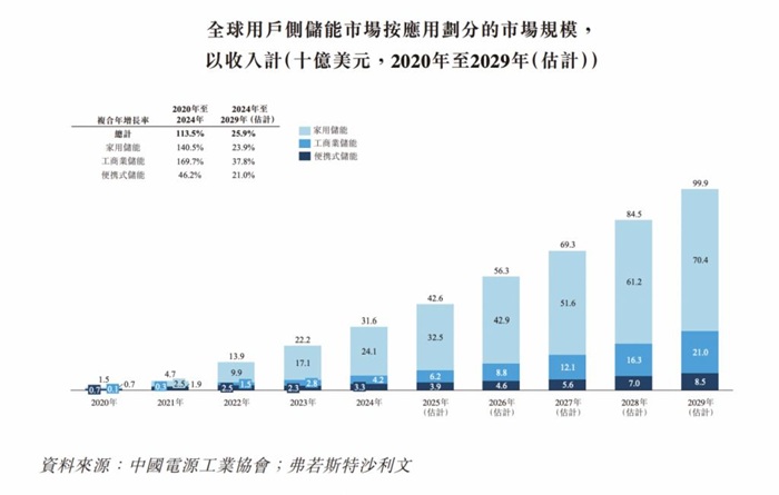 瑞财经 刘治颖 2 月 15 日,深圳市德兰明海新能源股份有限公司(以下简称 " 德兰明海 ")向港交所递交上市申请,清科资本为独家保荐人。 招股书显示,德兰明海成立于 2013 年,是中小型用户侧储能解决方案的供应商和创新者。公司于 2020 年发布 BLUETTI 品牌。截至 2025 年 12 月 31 日,公司在全球出货量超过 350 万台;且截至最后实际可行日期,公司的产品组合保持零召回的优异安全纪录。 根据弗若斯特沙利文的资料,德兰明海 2024 年在全球便携储能设备制造商中排名第四,按收入计算的市场份额为 6.6%,按出货量计算的市场份额为 7.5%。 储能指对电能的储存,涵盖利用化学或物理方法将电能储存并于需要时释放的技术及措施。根据电力系统中应用场景,储能可以划分为用户侧储能、电源侧储能以及电网侧储能。用户侧储能指位于终端用户、消费者住宅或者工厂等区域内部的储能系统,包括便携式储能、家用储能和工商业用储能。 以收入计,全球用户侧储能市场规模从 2020 年的 15 亿美元增长至 2024 年的 316 亿美元,2020 年至 2024 年的复合年增长率为 113.5%,预计到 2029 年全球用户侧储能市场规模将达到 999 亿美元,2024 年至 2029 年的复合年增长率为 25.9%。其中,按应用场景划分,2024 年全球家用储能、工商业储能及便携式储能的收入规模分别达到 241 亿美元、42 亿美元、33 亿美元,2020 年至 2024 年的复合年增长率分别为 140.5%、169.7%、46.2%。 全球便携式储能市场的市场规模按收入计由 2020 年的 7 亿美元增加至 2024 年的 33 亿美元,于 2020 年至 2024 年的复合年增长率为 46.2%。其中,2024 年北美、欧洲、其他已开发国家及新兴市场的便携式储能市场的市场规模按收入计分别达 16 亿美元、9 亿美元、6 亿美元及 2 亿美元,于 2020 年至 2024 年的复合年增长率分别为 41.4%、77.8%、40.8% 及 26.0%。 至 2029 年,全球便携式储能市场的市场规模按收入计预期将达 85 亿美元,于 2024 年至 2029 年的复合年增长率为 21.0%。其中,北美、欧洲、其他已开发国家及新兴市场的便携式储能市场的市场规模按收入计分别预期达 32 亿美元、18 亿美元、17 亿美元及 19 亿美元,于 2024 年至 2029 年的复合年增长率分别为 14.9%、14.9%、23.0% 及 56.3%。 以收入计,按应用划分,2024 年全球便携式储能在户外活动应用场景下的市场规模达到 14 亿美元,占总市场规模的比例达到 42.4%,2020 年至 2024 年的复合年增长率达到 54.6%。2024 年全球便携式储能在应急备灾应用场景下的市场规模达到 12 亿美元,占总市场规模的比例达到 39.4%,2020 年至 2024 年的复合年增长率达到 44.3%。展望未来,随着房车、露营等户外活动对电力需求的增长,以及工程应用的移动化、清洁资源趋势推动其在户外勘探、小型施工和移动办公等专业领域的广泛使用,全球便携式储能在不同应用下的市场规模将持续提升,并预计于 2029 年全球便携式储能市场按收入计及按应用细分在户外活动、应急备灾及工程类应用的市场规模将分别达 38 亿美元、27 亿美元及 12 亿美元。 |