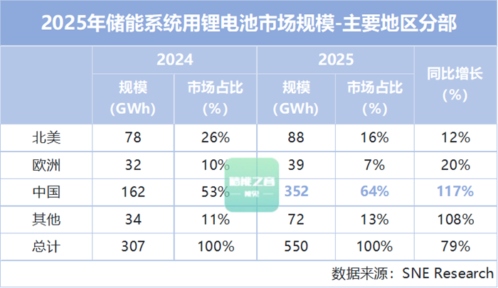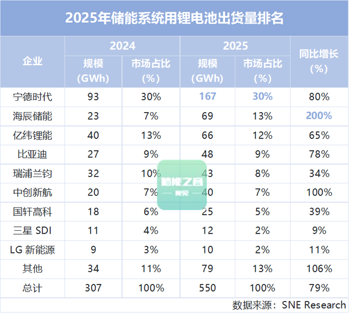 根据韩国SNE Research 1月28日发布的数据,2025年全球储能系统用锂离子电池市场规模达到550GWh,较 2024 年的307GWh同比增长79%,实现高速增长。 其中,中国国内市场不仅拿下全球超六成的市场份额,中国锂电企业更包揽全球出货量前七名,合计市场占比超八成,在全球储能锂电池领域形成 “断档” 领先的格局。 从区域市场格局来看,中国市场的领先地位进一步巩固。2025 年中国储能用锂电池市场规模达 352GWh,以64%的市占率位居全球第一,同比增速更是高达117%,成为拉动全球市场增长的核心动力。 排名第二的北美市场与中国差距显著,2025 年其市场规模为88GWh,市占率由去年的26%降至16%,且是全球各区域中同比增速最低的储能市场。这一现状主要受北美核心市场美国的相关政策影响,其对中国施加的高关税政策,直接阻碍了高性价比的中国磷酸铁锂电池对美供应,进而拖累了北美整体储能市场的增长节奏。 从各锂电池企业的竞争格局来看,本次 SNE 发布的榜单中,2025年市占率排名前七的企业均为中国企业,而韩国锂电池企业的整体市占率仅约 4%,较去年同期出现下滑。 其中,宁德时代以167GWh出货量、30%市占率蝉联第一,出货量较去年同期增长80%,稳固了龙头地位。 海辰储能实现跨越式发展,从2024年的第五位跃居全球第二,出货量达69GWh、市占率为13%,较2024年的23GWh同比激增200%,是增速最快的企业,同时也成为榜单中的最大黑马。 亿纬锂能则以微小差距退居第三,其2025年储能电池出货量为66GWh,同比增长65%,市占率为12%。 此外,另外四家中国企业比亚迪、瑞浦兰钧、中创新航、国轩高科分列第四至第七位,均占据较高的市场份额,且出货量均实现显著增长。 整体来看,上述 7 家中国企业2025年储能电池合计出货量达 458GWh,市场占有率高达 83.3%,较去年同期进一步提升,凸显出中国企业在全球储能领域“断档”领先、无可撼动。 反观韩国锂电企业,其在本次储能榜单中的表现则相形见绌。 2025年三星SDI、LG新能源的储能用锂电池市占率仅位列全球第八、第九位,两家企业合计出货量22GWh,仅占全球市场的4%;尽管二者出货量较去年同期略有增长,但市占率的下滑,反映出其在储能锂电市场的竞争力持续减弱。 中国锂电企业能占据如此高的市场份额,核心原因在于中国企业量产的磷酸铁锂电池,其产品特性与储能系统的应用需求高度适配。储能系统作为部署于户外的能源存储设施,无需像车用锂电池那样追求极致的高能量密度,反而对电池的安全性、性价比提出了更高要求,而中国企业量产的磷酸铁锂电池,恰好完美契合这一核心需求。 反观韩国锂电企业,此前始终以镍钴锰、镍钴铝等三元锂电池为核心布局储能市场,加之其本土储能市场此前已率先出现萎缩,多重因素叠加,最终导致其在榜单中市占率持续下滑。 面对当前的市场格局,韩国锂电企业也开始调整布局,计划将其在美国布局的车用锂电池生产线改造为磷酸铁锂电池生产线,试图借此抢占北美储能市场份额。不过业内普遍认为,在除中国、欧洲、韩国之外的全球其他储能市场,高性价比的中国产磷酸铁锂电池仍将占据市场主流,中国企业在储能锂电领域的竞争优势短期内难以被撼动。 |