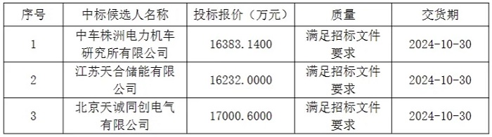 储能中国网获悉,10月17日,中国电建公示中电建新能源集团股份有限公司2024年储能系统设备集中采购项目中标候选人。中车株洲电力机车研究所有限公司以投标报价16383.14万元(折合单价约0.491元/Wh)预中标。 具体中标候选人情况如下: 第一中标候选人:中车株洲电力机车研究所有限公司,投标报价为16383.14万元,折合单价约0.491元/Wh; 第二中标候选人:江苏天合储能有限公司,投标报价为16232万元,折合单价约为0.486元/Wh; 第三中标候选人:北京天诚同创电气有限公司,投标报价:17000万元,折合单价约为0.509元/Wh。 根据招标信息,中电建新能源集团股份有限公司2024年储能系统设备集中采购项目涉及中电建托克逊县100万千瓦风电项目、中电建沙雅25万千瓦光伏项目、中电建广宗风力发电项目、秦安县王铺镇50MW风电项目、永靖县十四五坪沟光伏发电项目5个投资建设项目的储能系统设备采购,规模为167MW/334MWh。 原文如下: 中国电建中电建新能源集团股份有限公司2024年储能系统设备 集中采购项目中标候选人公示 (招标编号:POWERCHINA-00-240099) 一、评标情况 中国电建中电建新能源集团股份有限公司 2024 年储能系统设备集中采购项目已完成评标工作。根据评标委员会提交的评标报告,已经确认评标结果,现进行中标候选人公示,接受社会各界监督。 二、中标候选人基本情况 1、中标候选人基本情况,详见下表: 标段/标包/组包名称:中国电建中电建新能源集团股份有限公司 2024 年储能系统设备集中采购项目。