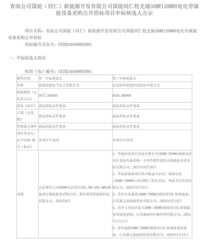 储能中国网获悉,10月23日,国能同仁牧光储30MW/120MWh电化学储能设备采购中标候选人公示,思源清能以投标单价0.473元/Wh预中标。 此次30MW/120MWh储能设备采购是同仁200MW牧光储多能互补综合一体化光伏建设项目配套储能,共配置12套容量为2.5MW/10MWh组串式储能机组。 中标候选人情况如下: 第一中标候选人:思源清能报价5677.2万元,折合单价0.473元/Wh; 第二中标候选人:海博思创报价6356.4万元,折合单价0.53元/Wh。 根据招标公告,招标范围为负责储能系统所需的设备供货、指导安装、调试。包括电池系统、电池管理系统(BMS)、能量管理系统(EMS)、储能逆变器(PCS)、箱式升压变压器以及其他电气设备等供货范围内设备元件的选型、设计、制造、图纸资料、出厂试验、供货、包装、发运、交货、调试、协助检测、协助验收等。 原文如下:
