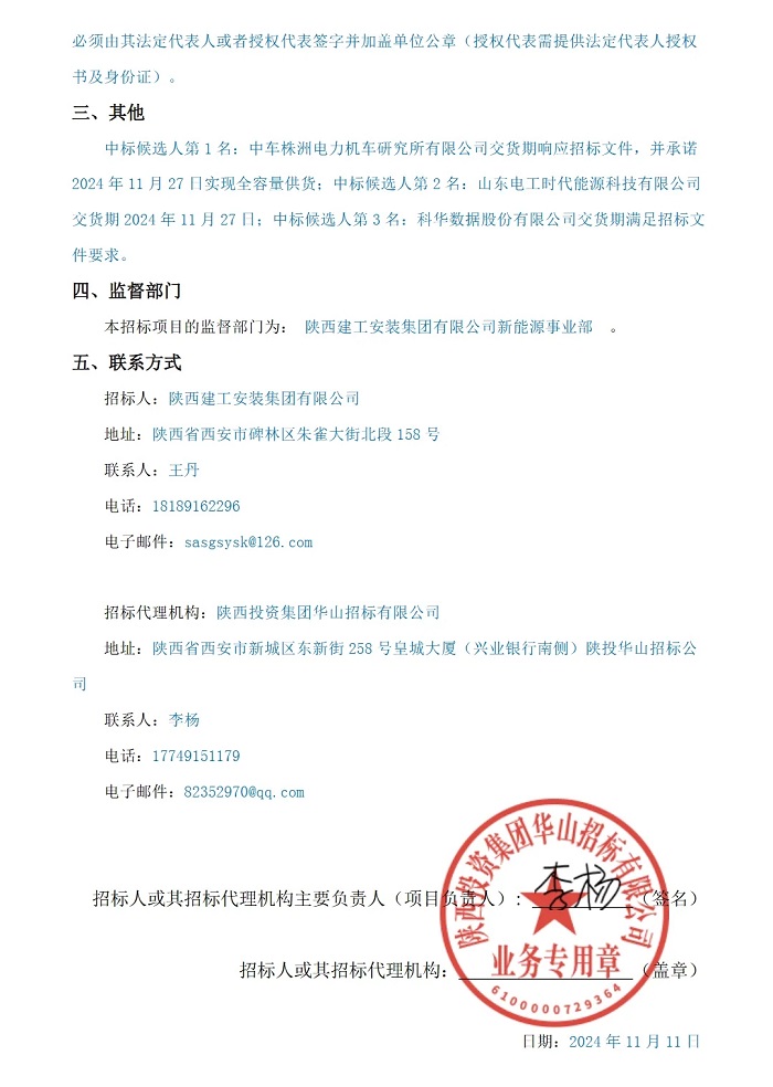 储能中国网获悉,11月1日,陕投喀什地区麦盖提县50万千瓦光伏治沙发电项目储能系统设备采购中标候选人公示,储能规模50MW/100MWh。中车株洲所以单价0.538元/Wh预中标。 根据招标公告,本项目新建一座配套储能电站。总装机容量为50MW/100MWh,放电倍率为0.5C,共设置20个储能电池舱,10个变流升压一体机舱。储能场区的电能经过变流升压一体机升压至35kV之后以两回集电线路接入升压站35kV配电装置室。 中标候选人情况如下: 第一中标候选人:中车株洲电力机车研究所有限公司,投标报价5380万元,折合单价0.538元/Wh; 第二中标候选人:山东电工时代能源科技有限公司,投标报价5268.13万元,折合单价0.527元/Wh; 第三中标候选人:科华数据股份有限公司,投标报价5220万元,折合单价0.522元/Wh。 中标候选人公告原文如下: