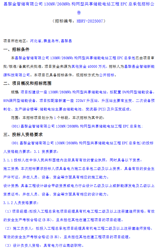 储能中国网获悉,3月19日,昌黎县金智储新能源科技有限公司发布130MW/260MWh构网型共享储能电站工程EPC总承包。项目资金来源为其他资金40000万元,位于河北秦皇岛市昌黎县。 项目拟建设一座130MW/260MWh构网型共享储能电站,拟配置5%构网型储能设备,95%跟网型储能设备,项目拟配套新建一座220kV升压站,升压站主要有主变、二次设备预制仓、生产综合楼等:储能电站主要由储能电池、变流器(PCS)及升压变组成。 原文如下: