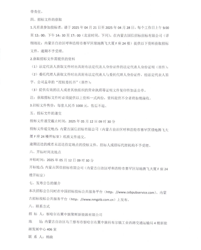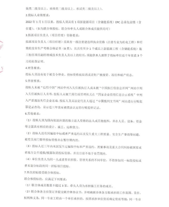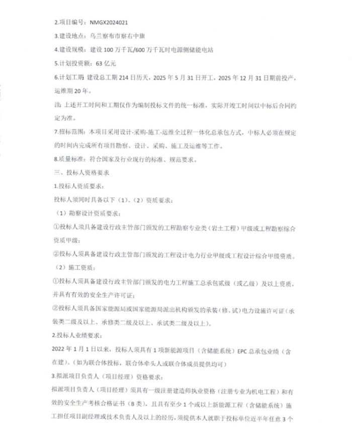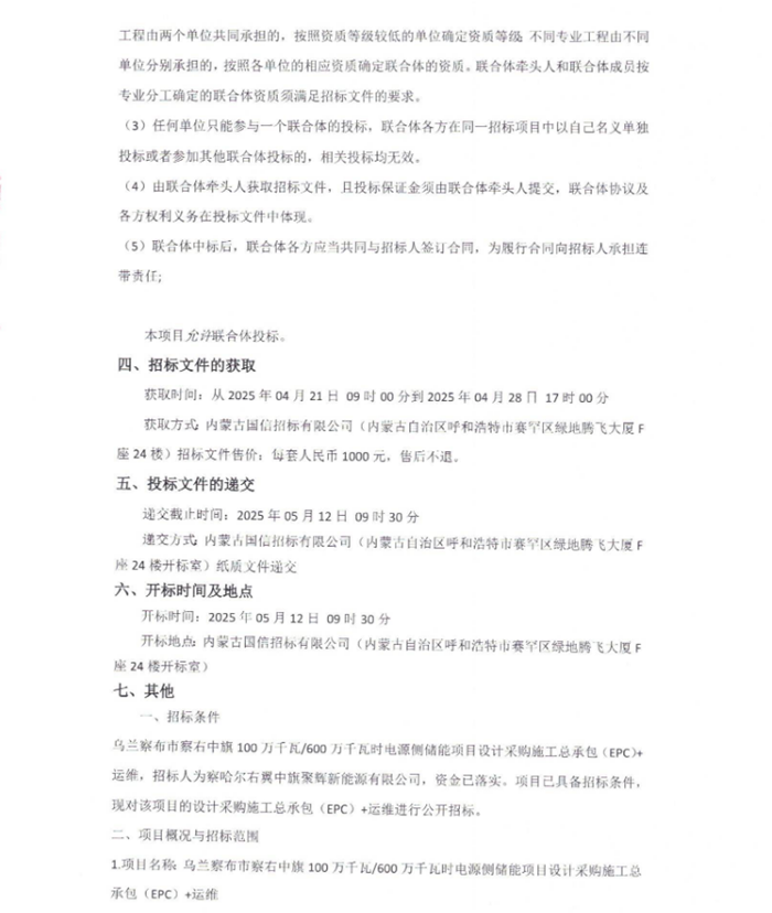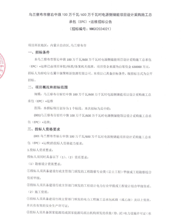 储能中国网获悉,4月21日,察哈尔右翼中旗聚辉新能源有限公司发布乌兰察布市察右中旗100万千瓦/600万千瓦时电源侧储能项目设计采购施工总承包(EPC)+运维招标公告。该项目总规模为1GW/6GWh,自筹资金63亿元。 招标范围:本项目采用设计-采购-施工-运维全过程一体化总承包方式,中标人必须在规定时间内完成所有项目勘察、设计、采购、施工及运维等工作。 计划工期:建设总工期214日历天,2025年5月31日开工,2025年12月31日期前投产,运维期20年(实际开竣工时间以中标后合同约定为准)。 投标人业绩要求:2022年1月1日以来,投标人须具有1项新能源项目(含储能系统)EPC总承包业绩(含在建)(如为联合体投标,联合体牵头人或联合体成员提供均可)。 联合体投标的,联合体成员数量不超过3家,牵头人须为承担施工任务的成员。 招标文件获取时间:从2025年04月21日09时00分到2025年04月28日17时00分。 投标文件递交截止时间:2025年05月12日09时30分。 原文如下: