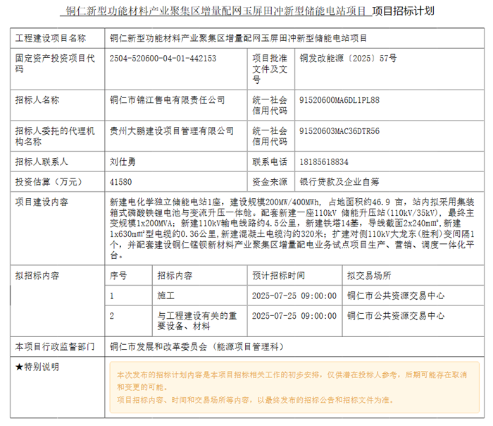 储能中国网获悉,7月14日,贵州铜仁发布新型功能材料产业聚集区增量配网玉屏田冲新型储能电站项目项目招标计划。 项目建设内容: 新建电化学独立储能电站1座,建设规模200MW/400MWh, 占地面积约46.9 亩,站内拟采用集装箱式磷酸铁锂电池与变流升压一体舱。配套新建一座110kV 储能升压站(110kV/35kV), 最终主变规模1x200MVA;新建110kV输电线路约4.5公里,新建铁塔14基,导线截面2x240m㎡,新建1x630m㎡型电缆约0.36公里,新建混凝土电缆沟约320米;扩建对侧110kV大龙东(胜利)变间隔1个,并配套建设铜仁锰钡新材料产业聚集区增量配电业务试点项目生产、营销、调度一体化平台。 拟招标内容: 1 施工 2025-07-25 09:00:00 2 与工程建设有关的重要设备、材料 |