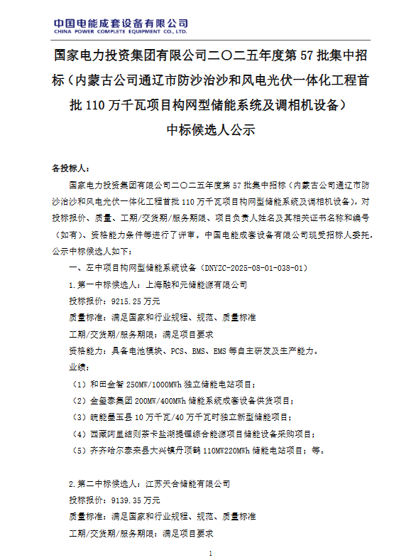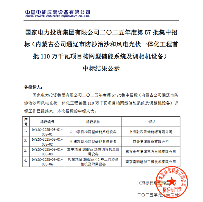 储能中国网获悉,9月12日,国家电投发布内蒙古公司通辽市防沙治沙和风电光伏一体化工程首批 110万千瓦项目构网型储能系统及调相机设备中标结果公示,中标结果显示,融和元储、双登股份分别以9215.25万元和9358.80万元中标82.5MW/165MWh构网型储能系统采购。
