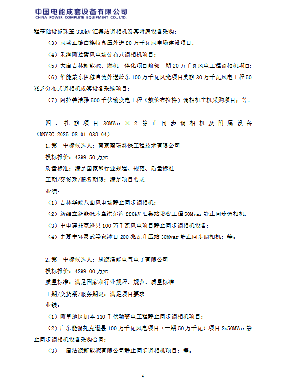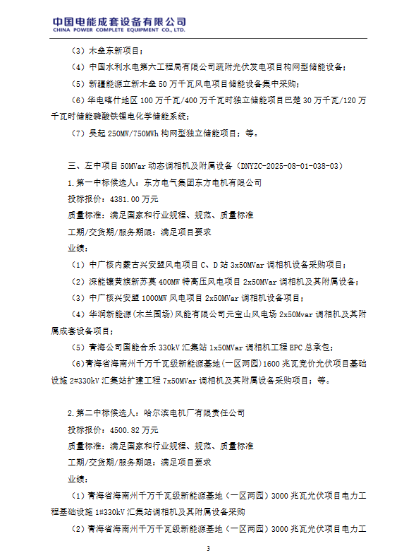 根据招标公告,通辽市防沙治沙和风电光伏一体化工程首批1.1GW项目分为扎鲁特旗防沙治沙和风电光伏一体化工程首批550MW和科左中旗防沙治沙和风电光伏一体化工程首批550MW,分别建设200MW风电和350MW光伏。项目建设要求按总容量15%/2h 配置储能,此次招标采购的左中项目和扎旗项目构网型储能系统规模分别为82.5MW/165MWh,且均要求电芯容量不小于314Ah,单箱容量不小于5MWh。 附中标候选人情况