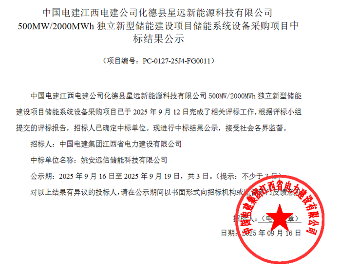 储能中国网获悉,9月16日,中国电建江西电建公司化德县星远新能源科技有限公司500MW/2000MWh 独立新型储能建设项目储能系统设备采购项目中标结果公示。 招标人:中国电建集团江西省电力建设有限公司 中标单位名称:姚安远信储能科技有限公司 原文如下:
