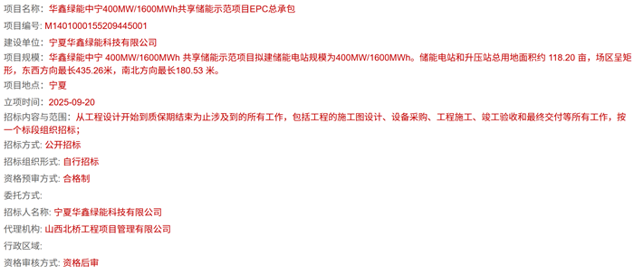 储能中国网获悉,9月20日,华鑫绿能发布中宁400MW/1600MWh共享储能示范项目EPC总承包招标公告。公告表示,项目位于宁夏回族自治区中卫市中宁县恩和镇,拟建储能电站规模为400MW/1600MWh。储能电站和升压站总用地面积约118.20亩,场区呈矩形,东西方向最长435.26米,南北方向最长180.53米。 招标范围:从工程设计开始到质保期结束为止涉及到的所有工作,包括工程的施工图设计、设备采购、工程施工、竣工验收和最终交付等所有工作,按一个标段组织招标。 具体如下: