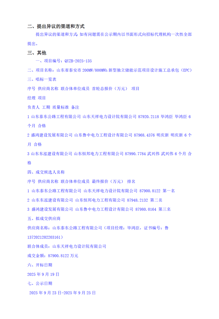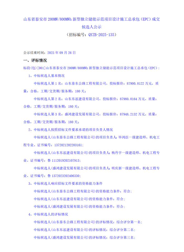 储能中国网获悉,9月22日,山东省泰安市200MW/800MWh新型独立储能示范项目设计施工总承包(EPC)成交候选人公示。根据公示,山东泰东公路工程有限公司以投标报价1.0988元/Wh预中标。 具体中标候选人详情为: 第一中标候选人:山东泰东公路工程有限公司,投标报价为87900.81万元,折合单价为1.0988元/Wh; 第二中标候选人:山东东泓建设有限公司,投标报价为87980.02万元,折合单价为1.0998元/Wh; 第三中标候选人:盛鸿建设发展有限公司,投标报价为87948.21万元,折合单价为1.0994元/Wh。 原公告如下: